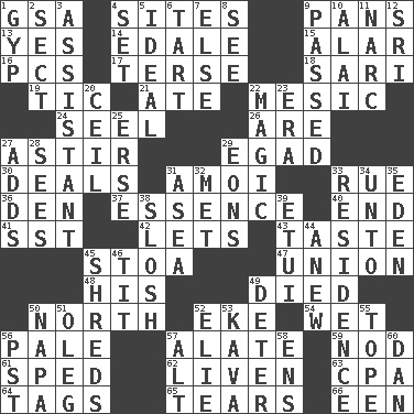 ACROSS 1. Girls' org. (abbr.) 4. Locates 9. Baking dishes 13. Consenting reply 14. Peak District village in England 15. Having or resembling wings 16. Personal Computers (abbr.) 17. Laconic 18. Indian skirt 19. Nervous spasm 21. Had dinner 22. Of or pertaining to a meson 24. Stitch closed the eyes of (a falcon) 26. "We ___ not amused" (Victoria) 27. Moving about 29. Mild oath 30. Allots cards 31. Mine, in Marseilles 33. Regret 36. Lair 37. Substance 40. Conclusion 41. Fast jet (abbr.) 42. Allows 43. Clothes sense 45. Portico 47. The state of being joined or united 48. Part of HMS, perhaps 49. Passed on 50. 0 degrees 52. Supplement with great effort 54. Dripping 56. Light colored 57. Having winglike extensions 59. Allow head to fall sleepily 61. Hurried 62. Make or become more lively 63. Tax preparer (abbr.) 64. Labels 65. Lacerates 66. Car or cant ending DOWN 1. Hustle 2. Religious group 3. Helper 4. Put into a specified state 5. Perfect 6. Small pie 7. Otherwise 8. Perceive with the eye 9. Went by 10. Jai _ 11. Drug cop 12. Indian title of respect (Mr.) 20. To provide with a ceiling 22. Mysterious quality of enchantment 23. Epoch 25. Celtic language 27. Sums up 28. Perceives with the eye 29. Immeasurably long periods of time 31. Toward the sea 32. Was introduced to 33. Home 34. To (old English) 35. Paradise 38. Make a splashing sound 39. Needle case 44. Afresh 45. Tears up 46. Teat (slang) 49. Prevent from occurring 50. California wine valley 51. Cassini of fashion 52. Writer Wiesel 53. Polynesian shrub of the pepper family 55. Drink excessively 56. Pacific Standard Time (abbr.) 57. Keyboard modifier key 58. Followers of ems 60. One of the 12 tribes of Israel