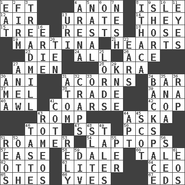 ACROSS 1. Bank Draft (abbr.) 4. Soon (poet.) 8. Capri or Wight 12. Atmosphere 13. A salt of uric acid 14. Those people 15. Relationship diagram 17. Musical pauses 18. Stockings 19. Chrissie's court nemesis 21. Centers 23. Pass on 24. 100% 26. Adept person 27. So be it 28. Gumbo ingredient 30. Cuckoo 31. Oak nuts 34. Drinking establishment 37. Cartoonist voice _ Blanc 38. Buy and sell 39. Santa ___, CA 40. Leather borer 41. Unrefined 42. Police officer (slang) 43. Play 44. "____ silly question..." 46. Small child 47. Fast jet (abbr.) 50. Personal Computers (abbr.) 51. Wanderer 54. Portable computers 57. Relaxation 58. Peak District village in England 60. Story 62. "Beetle Bailey" pooch 63. 61 cubic inches 64. Corporate head (abbr.) 65. "______ My Girl" (Turtles hit) 66. Jacques Cousteau's middle name 67. Begley and Asner DOWN 1. Erode 2. Unshakable 3. Excercise machine 4. Sports stadium 5. Relating to the nose 6. Baseball player Mel 7. Delicate 8. New York city 9. Dinah or Pauly 10. For fear that 11. Snake ____ (dice throw) 13. RI univ. 16. 4th largest of the Great Lakes 20. "___ Little Indians" 22. Hearing organs 25. Nobles 27. Afresh 29. Leg joint 30. Nursemaid (var.) 31. Tiny particle 32. Dice game 33. Boat paddle 34. Keyboard key 35. Small Philippine buffalo 36. Reproach for some lapse or misdeed 41. ____ d'Azur (French Riviera) 43. Lover boys 44. Fitting 45. Native of Scotland 46. Clothes sense 48. Chalkboard 49. Lies 51. Vintage cars 52. Pledge 53. Have confidence or faith in 55. For each 56. Downhill vehicle 59. HTML Container Element 61. Greek goddess of the dawn