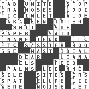 ACROSS 1. Bar bill 4. Join together 9. Close up, plug up 13. Lyricist Gershwin 14. Olfactory organs 15. Farming town in central California 16. Nervous spasm 17. An arm off of a larger body of water 18. Medicinal plant 19. Alias (abbr.) 21. Car or cant ending 22. Carrier 24. Stricken, poetically 26. Institute legal proceedings 27. Some stationery 29. Stated 30. Empty; void 31. Watch over 33. Affectionate concern, for short 36. And so on (abbr.) 37. More impudent 40. Friend of Pooh 41. Compass dir. 42. Vertical spar for supporting sails 43. Standard of perfection 45. Letter starter 47. Climbing, woody, usually tropical vines 48. Raised railways 49. Nourish 50. Insides of hands 52. Area sheltered from the wind 54. Madame (abbr.) 56. Filth; sediment 57. Settings 59. Big collection agency 61. Argument over a trivial matter 62. Evade 63. Cards in a Roman deck? 64. We are 65. Annoying sound 66. Allow DOWN 1. Teat (slang) 2. Operatic vocal solo 3. Keyboard key 4. University (slang) 5. Music written for nine 6. Small island 7. Adolescent 8. Eastern Standard Time (abbr.) 9. Scheduled 10. Lacquered or enameled metalware 11. Scent 12. Sliced dessert 20. So be it 22. Sadhe (variant) 23. Fr. "Yes" 25. Angers 27. Sliced desserts 28. Pismires 29. In a ____ (agitated or irritated) 31. Russian ruler of old 32. Double-curved letter 33. Excercise machine 34. Grant temporary use of 35. Root beer relative 38. Collect or gather 39. Cause heat under the collar 44. South Vietnam president (1954) 45. Keyboard key 46. Shade tree 49. Eats 50. Corncob 51. Having or resembling wings 52. _ and Stitch 53. Needle case 55. 4th largest of the Great Lakes 56. Compass dir. 57. Elected rep. 58. Observe 60. Be seated