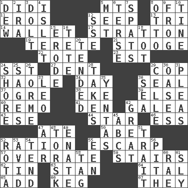 ACROSS 1. "You Light Up My Life" star Conn 5. Mountains (abbr.) 8. Often (poetically) 11. Greek god of love 12. Ooze 13. Three (prefix) 14. Place for singles 17. Ski resort town in Vermont 19. Cigar-shaped 21. Moe Howard, for one 22. Carryall 23. Eastern Standard Time (abbr.) 24. Fast jet (abbr.) 27. Gouge 29. Police officer (slang) 32. White Person, in Hawaii 34. 24 hours 36. Lick closed 37. Legendary monster 38. Supplement with great effort 39. Otherwise 40. San ____ (Riviera town) 41. Lair 42. An organ shaped like a helmet 43. Compass dir. 44. Play the lead 46. Curvy letter 47. Had dinner 50. Collude with 52. Food allowance for one day 55. Fortification 57. Make much ado about nothing 59. Flight of steps 62. Metal container 63. Comedian Laurel of Laurel & Hardy 64. Slanted text style (abbr.) 65. Increase 66. Barrel 67. Those people DOWN 1. Morning condensation 2. Retirement account (abbr.) 3. Stupid person 4. Small island 5. Was introduced to 6. Laconic 7. Arguments over trivial matters 8. "Beetle Bailey" pooch 9. Tree-dwelling hopper 10. Prong on a fork 12. Compass dir. 15. Wear away 16. False hair 18. Small child 20. Looked after 24. Dinah or Pauly 25. Gurus 26. Singer Mel 28. Receives possession of 29. Cell (Danish) 30. Fertile tracts in a desert 31. Entreaties 33. Lion 35. Gossips 36. Ocean 42. Relatively large 45. Lettered men learn these first 47. Wind 48. Cod relative 49. Related on the mother's side 51. Distinguishing feature 52. Round or rotation of duties 53. Enthusiastic 54. Look after 55. Car or cant ending 56. Essential or central part 58. Label 60. Actress Charlotte 61. Roguish