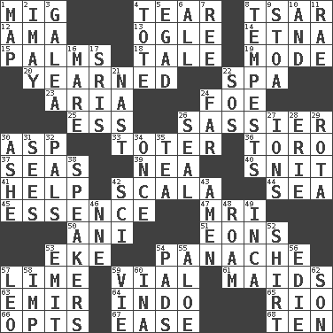 ACROSS 1. Russian fighter aircraft 4. Separate forcefully 8. Russian ruler of old 12. Housemaid (var.) 13. Stare at amorously 14. Inactive volcano in Sicily 15. Insides of hands 18. Story 19. Method 20. Had a strong desire 22. Health resort 23. Roberta Peters solo 24. Enemy 25. Curvy letter 26. More lively and spirited 30. Cleo's killer 33. Carrier 36. "Corrida" creature 37. Oceans 39. Teachers' org. 40. In a ____ (agitated or irritated) 41. Aid 42. Any of the three canals of the cochlea 44. Ocean 45. Core 47. Medical imaging device (abbr.) 50. Black tropical American cuckoo 51. Immeasurably long periods of time 53. Make supply last 54. Flamboyance 57. Citrus frut 59. Small bottle 61. Unmarried girls 63. Arab leader 64. _ china 65. River (Sp.) 66. Elects 67. Relaxation 68. "___ Little Indians" DOWN 1. Atlas unit 2. "If ____ say so..." 3. An organ shaped like a helmet 4. Carryall 5. Mild oath 6. 100% 7. Portuguese money of account (variant) 8. Storms 9. Portico 10. Also 11. Actress Charlotte 16. Female horse 17. Indian titles of respect 21. Political cartoonist Thomas 22. Mayday 24. Distant 26. Lick closed 27. Charged atoms 28. One of the Great Lakes 29. Roll call or roster of names 30. American tennis player Robert 31. Perceives with the eye 32. Friends 34. At one time in the past 35. Beverage made from leaves 38. Orators 42. _-fi 43. So be it 46. Compass dir. 48. Wander 49. South American Indian 52. Upper-body garment 53. Send forth 54. Groovy apts. 55. Medicinal plant 56. Singer Brickell 57. Lion 58. Naughty child 59. Compete 60. _ tizzy (2 wds.) 62. Manchild