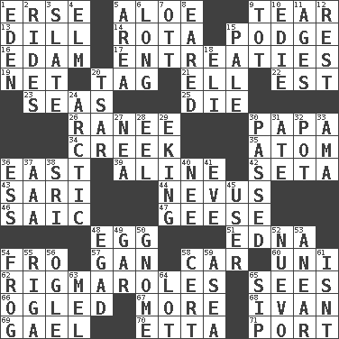 ACROSS 1. Celtic language 5. Medicinal plant 9. Pull apart 13. Deli pickle 14. Roll call or roster of names 15. Porridge 16. Dutch treat 17. Pleas 19. Remaining after all deductions 20. Label 21. Pipe bend 22. Eastern Standard Time (abbr.) 23. Oceans 25. Expire 26. Indian princess (variant) 30. Dad 34. Small stream 35. Tiny particle 36. Compass direction 39. Place in a line 42. Bristle 43. Indian skirt 44. Mole, birthmark 46. Ketch in the Levant 47. Honkers 48. Oval reproductive body of a fowl 51. Pulitzer Prize-winning author Ferber 54. From 57. Separate the seeds from cotton 58. 4-wheeled motor vehicle 60. Corn or form start 62. Complicated, petty procedures 65. Observes 66. Stared at amorously 67. Greater amount 68. _ the terrible 69. Highlander 70. Singer James 71. Sweet dark-red dessert wine DOWN 1. Paradise 2. Amusement-park features 3. Chalkboard 4. Shade tree 5. Length times width 6. Yearn 7. Baseball player Mel 8. Having ears or earlike features 9. Small child 10. Singer Brickell 11. Grows older 12. Relief 15. Light colored 18. Connecticut Ivy Leaguer 20. Russian ruler of old 24. Northern region 27. Teachers' org. 28. Snakelike fish 29. Supplementing with great effort 30. Went by 31. Had dinner 32. Plant holder 33. Housemaid (var.) 36. Double-curved letter 37. American Automobile Association (abbr.) 38. Indian title of respect (Mr.) 40. Born 41. First lady 45. One who makes use of a thing 48. Mild oath 49. Slender fish 50. Dwarf 52. New (sp.) 53. Approach 54. Toadlike animal 55. Capital of Latvia 56. Stare 58. An absolute certainty 59. Toward the sea 61. Is not 63. Cartoonist voice _ Blanc 64. Car dealer's back yard 65. Small drink