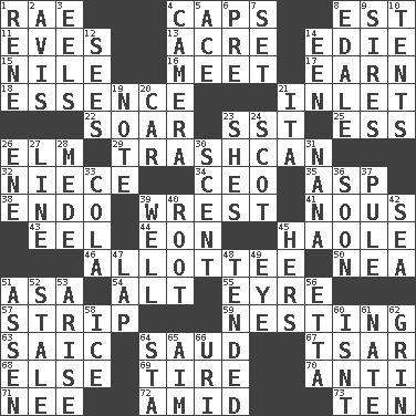 ACROSS 1. Actress Charlotte 4. Smile enhancers 8. Eastern Standard Time (abbr.) 11. Nights before holidays 13. Measure of real estate 14. Singer Brickell 15. The longest river in the world 16. Rendezvous 17. Merit 18. Center 21. An arm off of a larger body of water 22. Fly high 23. Fast jet (abbr.) 25. Double-curved letter 26. Shade tree 29. File 13 32. Sibling's daughter 34. Corporate head (abbr.) 35. Cleo's killer 38. Inside; within (prefix) 39. Take or capture by force 41. Horse sense 43. Snakelike fish 44. Period of immesurable duration 45. White Person, in Hawaii 46. One to whom something is allotted 50. Teachers' org. 51. White ___ sheet 54. The first octave above the treble staff 55. Jane of fiction 57. Long narrow piece of something 59. Snuggling 63. Ketch in the Levant 64. Saudi Arabian king (1953-1964) 67. Russian ruler of old 68. Otherwise 69. Hoop that covers a wheel 70. Opposed to 71. Born 72. Among 73. "___ Little Indians" DOWN 1. French philosopher Descartes 2. Opinion 3. Snakelike fish 4. Device for capturing images 5. Adept person 6. Before (prefix) 7. Put into a specified state 8. Peak District village in England 9. Fathers 10. Portable shelters 12. Perceives with the eye 14. Car or cant ending 19. Musical sound 20. Auto 21. Call ___ day 23. "______ My Girl" (Turtles hit) 24. Highlander 26. Compass dir. 27. Actor's bit 28. Ancient Persian 30. Odor 31. Nanny 33. Root beer relative 36. Within a short period 37. Whine 39. Not ill 40. Carrot, for example 42. Ocean 45. Possessive pronoun 47. Infant locale 48. Watched over 49. Sight organ 51. NE Netherlands city 52. Having lost freshness 53. Get up 56. Singer James 58. Frozen water 60. Is not 61. Nathan's nickname 62. Amused look 64. R.R. building 65. Direct toward a target or goal 66. RI univ.