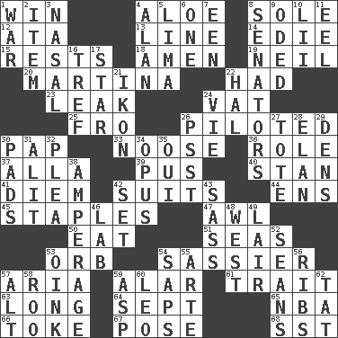 ACROSS 1. Acquire through effort 4. _ vera 8. Not divided or shared with others 12. "One Day ___ Time" 13. Actor's bit 14. Singer Brickell 15. Musical pauses 18. So be it 19. Famous astronaut Armstrong 20. Chrissie's court nemesis 22. Possessed 23. Path through which fluid escapes 24. Large container 25. From 26. Manned the helm 30. Infant food 33. Trap for birds or small mammals 36. Hero or heavy, e.g. 37. Silent film actress Nazimova 39. Fluid product of inflammation 40. Comedian Laurel of Laurel & Hardy 41. South Vietnam president (1954) 42. Sets of matching outer garments 44. Followers of ems 45. Paper fasteners 47. Leather borer 50. Consume 51. Oceans 53. Globe 54. More disrespectful 57. Operatic vocal solo 59. Having or resembling wings 61. Distinguishing feature 63. Having great length 64. Back-to-school mo. 65. Basketball assoc. 66. Casino tip 67. Airs 68. Fast jet (abbr.) DOWN 1. Armed conflict 2. Detail 3. Rhinal 4. ____ Jay Lerner 5. Pale green bean 6. Single 7. Car or cant ending 8. Legislators 9. Wrote a lyric poem 10. Cards in a Roman deck? 11. Snakelike fish 16. Unclean, religiously 17. Play the lead 21. Picture 22. Actor Linden 24. Compete 26. Inconspicuous attention getter 27. Lug 28. Enthusiasm 29. Cub Scout units 30. Groovy apts. 31. Came down and settled, as after flight 32. Entreaty 34. Musical composition 35. Fr. "Yes" 38. Electrical Measurement 42. Put into a specified state 43. Backtalk 46. Experiment locale 48. 270 degrees 49. Den 52. Actors Connery and Penn 53. Pig sound 54. Plant excrements 55. Johnson of "Laugh-In" 56. Teases 57. Keyboard modifier key 58. Friend of Pooh 59. Viper 60. Lion 62. Make lace