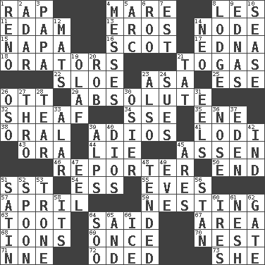 ACROSS 1. Strike 4. Female horse 8. French article 11. Dutch treat 13. Greek god of love 14. Thickened enlargement 15. California wine valley 16. Highlander 17. Pulitzer Prize-winning author Ferber 18. Speakers 21. Ancient Roman robes 22. A type of plum 23. White ___ sheet 25. Compass dir. 26. Baseball player Mel 29. Utter; complete 32. Bundle of cut stalks of grain 34. Compass dir. 35. Compass dir. 38. Taken by mouth 39. Goodbye (Sp.) 41. Farming town in central California 43. Mouth or opening 44. Untruth 45. NE Netherlands city 46. News announcer 50. Conclude 51. Fast jet (abbr.) 54. Double-curved letter 55. Nights before holidays 57. Showery time 59. Nestling 63. A blast of a horn 64. Expressed in words 67. Type of rug 68. Charged particles 69. Single time 70. Egg locale 71. Compass dir. 72. Wrote a lyric poem 73. A female animal or person DOWN 1. Western Nevada city 2. The sixth month of the Jewish calendar 3. Dad 4. Makes clutter 5. Curve 6. Friend of Pooh 7. Eastern Standard Time (abbr.) 8. Cabin 9. Ferber et al. 10. Gospel singer Marvin 12. Floor coverings 14. Modern: prefix 19. Norwegian king 20. Director Reiner 21. Make lace 23. In addition 24. Takes to court 26. Bear (Spanish) 27. Through, poetically 28. Pull into pieces 30. Flexible twig of a willow tree 31. Snakelike fish 33. Having or resembling wings 36. Sense of smell 37. Paradise 39. High mountains 40. "Vaya con ____" 42. Working for oneself (abbr.) 45. Ancient Greek god of war 47. Snakelike fish 48. Looked after 49. First lady 51. Smooth fabric 52. Soup utensil 53. Heavy duty weighing machine 56. Comedian Laurel of Laurel & Hardy 58. It is 60. Angers 61. Soft 62. Yard entry 64. "Barney Miller" actor Jack 65. Also 66. Frozen water