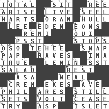 ACROSS 1. "_____ Recall" 6. Be seated 9. Portuguese money of account (variant) 12. Originate 13. Not recorded 14. Stitch closed the eyes of (a falcon) 15. Shops 16. Northwest Algerian city 17. Frame or body of a ship 18. Area sheltered from the wind 19. Paradise 20. Immeasurably long periods of time 21. Painter Guido (1575-1642) 23. Fr. "Yes" 24. Inconspicuous attention getter 25. Halts 28. Bear (Spanish) 30. Giggle 34. Fastener 35. Infant food 36. All-night dance parties 38. _ tizzy (2 wds.) 39. Loyal 41. Soviet premier 1918-24 43. Fast jet (abbr.) 44. First course 46. Relief 48. White ___ sheet 49. Anneal 50. Ship's personnel 51. Supplements with great effort 53. "___ Maria" 56. Silvers or Donahue 57. Ancient Greek god of war 58. Not moving 60. Puts into a specified state 61. Electrical Unit 62. Stop 63. Attempt to accomplish something 64. Viper 65. Small island DOWN 1. Scottish cap 2. Relating to the mouth 3. Hoop that covers a wheel 4. Michaelmas daisies 5. French article 6. The founder of a family 7. "Terrible" tsar 8. "___ Little Indians" 9. One who advocates reunion 10. Snakelike fish 11. Pipe bend 13. Farming town in central California 14. Yells 19. Keyboard key 20. Greek goddess of the dawn 22. Eastern Standard Time (abbr.) 24. Teen's desire 26. Baking dishes 27. Argument over a trivial matter 28. Chooses 29. "Two Mules for Sister ____" 31. Actor Linden 32. Night before a holiday 33. Car or cant ending 37. Fathers 40. Artist's stands 42. Teachers' org. 45. Obsolete 47. Chalkboards 49. A home for chicks 50. "Mermaids" star 51. Greek god of love 52. Seaweed 54. Small bottle 55. Otherwise 56. Pacific Standard Time (abbr.) 57. Actress Gardner 58. _-fi 59. Allow