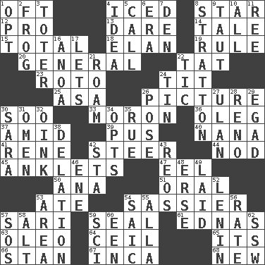 ACROSS 1. Often (poetically) 4. On the rocks 8. Play the lead 12. Adept person 13. Have the gumption 14. Lie 15. "_____ Recall" 18. Enthusiasm 19. Governing power 20. Commissioned military rank 22. Make lace 23. Printing process, for short 24. Teat (slang) 25. White ___ sheet 26. Photo 30. "Barney Miller" actor Jack 33. Person of subnormal intelligence 36. Cassini of fashion 37. Among 39. Fluid product of inflammation 40. Grandmother 41. French philosopher Descartes 42. Bull 44. Allow head to fall sleepily 45. Short socks 47. Snakelike fish 50. Santa ___, CA 51. Taken by mouth 53. Had dinner 54. More disrespectful 57. Indian skirt 59. Lick closed 61. Ferber et al. 63. Margarine 64. To provide with a ceiling 65. It is 66. Comedian Laurel of Laurel & Hardy 67. South American Indian 68. ___ Haven, CT DOWN 1. Choose 2. Toadlike animal 3. Carrier 4. The main thing one is thinking about 5. Give a ring to 6. Period 7. Lair 8. Ski resort town in Vermont 9. Drawn tight 10. 100% 11. To separate or throw off 16. Small Philippine buffalo 17. Allows 21. Wander 22. Nervous spasm 24. Metal container 26. Airs 27. Uhlan (variant) 28. Western Nevada city 29. Mild oath 30. "Two Mules for Sister ____" 31. Sign of something about to happen 32. Pig sound 34. Elects 35. Regret 38. Conveyance 42. R.R. building 43. Vintage cars 46. Compass dir. 48. Celtic language 49. Put down 52. Soviet premier 1918-24 53. Type of rug 54. Ketch in the Levant 55. Silent film actress Nazimova 56. Assign a rank or rating to 57. Mayday 58. Keyboard modifier key 59. _-fi 60. Car or cant ending 62. Compass dir.