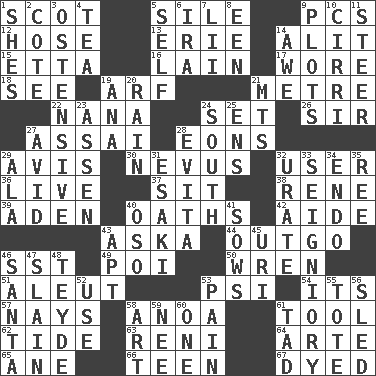 ACROSS 1. Native of Scotland 5. Filth; sediment 9. Personal Computers (abbr.) 12. Stockings 13. 4th largest of the Great Lakes 14. Set down 15. Singer James 16. (Had) reclined 17. Had on 18. Observe 19. Sandy's bark 21. Distance measurement (Brit.) 22. Grandmother 24. Arrange properly for use 26. Title for a knight 27. Slender Brazilian palm 28. Immeasurably long periods of time 29. Opinion 30. Congenital growth or mark on the skin 32. One who uses or employs something 36. Moving, as bait 37. Be seated 38. French philosopher Descartes 39. Arabian gulf 40. Profane or obscene expressions 42. Assistant 43. "____ silly question..." 44. Expenditure 46. Fast jet (abbr.) 49. Luau course 50. Songbird 51. Eskimo relative 53. Air pressure measure (abbr.) 54. ___ a Wonderful Life 57. Negative votes 58. Small Philippine buffalo 61. Utensil 62. Periodic rise and fall of the sea level 63. Painter Guido (1575-1642) 64. Johnson of "Laugh-In" 65. One (Scot) 66. Adolescent 67. Colored DOWN 1. "______ My Girl" (Turtles hit) 2. ____ d'Azur (French Riviera) 3. Clearly or manifestly demonstrative 4. Afternoon social gathering 5. Itself 6. Lyricist Gershwin 7. Cards in a Roman deck? 8. Car or cant ending 9. Small pieces of grounds 10. High-altitude cloud 11. Bull 14. Deep reverence 19. Santa ___, CA 20. Water falling in drops from the sky 21. Mountains (abbr.) 23. NE Netherlands city 24. 180 degrees 25. Followers of ems 27. Enthusiastic 28. Webber/Rice musical 29. According to 31. 1973 Nobel Price Winner (Physics) Leo 32. A salt of uric acid 33. Signiory (variant) 34. Inside; within (prefix) 35. To separate or throw off 40. Bear (Spanish) 41. Sty mamas 43. Fitting 45. RI univ. 46. Before Barbara or Clara 47. Killed 48. Miss Universe 1986, Barbara Palacios _ 52. Purpose 53. Ache 55. Carry 56. Downhill vehicle 58. Tate display 59. Born 60. Single 61. Bit