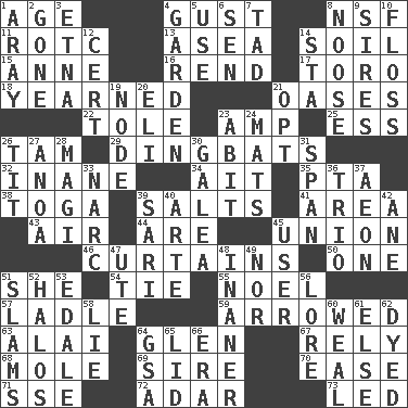 ACROSS 1. Ripen 4. Abrupt rush of wind 8. Overdraft (abbr.) 11. College mil. group 13. At sea 14. Earth 15. Queen of England 1702-14 16. Tear apart 17. "Corrida" creature 18. Had a strong desire 21. Fertile tracts in a desert 22. Lacquered or enameled metalware 23. Electrical Unit 25. Double-curved letter 26. Scottish cap 29. Empty-headed or silly people 32. Silly 34. Small island 35. Parent Teacher Association (abbr.) 38. Ancient Roman robe 39. Table seasonings 41. Type of rug 43. Atmosphere 44. "We ___ not amused" (Victoria) 45. The state of being joined or united 46. Window treatments 50. Single 51. A female animal or person 54. Make a knot 55. Christmas carol 57. Dipping utensil 59. Moved like an arrow 63. Jai _ 64. Small, secluded valley 67. Trust 68. Undercover agent 69. Title for a man of rank and authority 70. Comfort 71. Compass dir. 72. The sixth month of the Jewish calendar 73. Directed DOWN 1. Like ___ of sunshine 2. Went 3. Inactive volcano in Sicily 4. Place where plants grow 5. Purpose 6. Elected rep. 7. Small amount or degree 8. Trap for birds or small mammals 9. Founders of families 10. Soft thread for cleaning between teeth 12. Certainty 14. R.R. building 19. Thickened enlargement 20. Connecticut Ivy Leaguer 21. Elect 23. "This won't hurt ____!" 24. Floor coverings 26. Teat (slang) 27. Small Philippine buffalo 28. Wise men 30. An organ shaped like a helmet 31. Connect, as a bridge 33. Drug cop 36. Musical group of three 37. Period of immesurable duration 39. Indian skirt 40. Johnson of "Laugh-In" 42. A saturated hydrocarbon 45. One who uses or employs something 47. Shoshoni 48. More empty; more void 49. And not 51. Criticizes harshly 52. Auras 53. Peak District village in England 56. Old wives' tales, e.g. 58. Falsehood 60. Welt 61. Otherwise 62. Colored 64. Girls' org. (abbr.) 65. Flaplike covering 66. Epoch