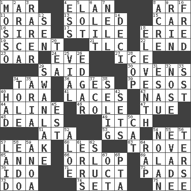 ACROSS 1. Make imperfect 4. Liveliness 8. Sandy's bark 11. Mouths or openings 13. Having a sole or soles 15. Automobile 16. Male parent of an animal 17. Vertical member of a panel or frame 18. One of the Great Lakes 19. Odor 21. Affectionate concern, for short 22. Grant temporary use of 23. Rowing implement 24. Night before a holiday 27. Frozen water 29. Expressed in words 30. Baking chambers 34. The 23rd letter of the Hebrew alphabet 36. Ripens 39. Mexican monetary units 40. Israeli folk dance 41. Shoestrings 43. Political cartoonist Thomas 44. Place in a line 46. Hero or heavy, e.g. 47. Third day of the wk. 48. Allots cards 49. Hankering 51. _ moment's notice (2 wds.) 53. Girls' org. (abbr.) 54. Remaining after all deductions 57. Path through which fluid escapes 60. French article 63. Collection of objects 65. Queen of England 1702-14 66. Fourth or lowest deck 69. Having or resembling wings 70. Wedding promise 71. Spew [out] 72. Groovy apts. 73. ___ good deed 74. Bristle 75. Born DOWN 1. With motion or animation 2. N. Chile seaport 3. Less widely known 4. Curvy letter 5. Car dealer's back yard 6. Came down and settled, as after flight 7. 1994 drama film starring Jodie Foster 8. Land measure 9. Water falling in drops from the sky 10. Flintstone 12. Elected rep. 14. Tenth: prefix 18. Veterans Day date 20. Afternoon social gathering 25. Small bottle 26. _ Allan Poe 28. Police officer (slang) 29. Tchaikovsky ballet 31. He sold his birthright 32. Sense of smell 33. Fast jet (abbr.) 34. Lacquered or enameled metalware 35. Operatic vocal solo 37. Environmental prefix 38. Former Milwaukee Brewers owner Bud 40. Possessed 42. Puts into a specified state 45. Eastern Standard Time (abbr.) 50. Feline 52. Medicinal plant 54. Pitcher Ryan 55. Elude 56. Laconic 57. Put down 58. Inside; within (prefix) 59. Small Philippine buffalo 61. Blunders 62. Change direction abruptly 64. Reproach for some lapse or misdeed 67. Sep. follower 68. Parent Teacher Association (abbr.)