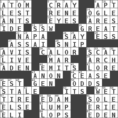ACROSS 1. Tiny particle 5. Supercomputer manufacturer 9. Fitting 12. For fear that 13. French philosopher Descartes 14. Stare 15. Pismires 16. Snake ____ (dice throw) 17. Ancient Greek god of war 18. Binary compound 19. Compass dir. 21. Relatively large 22. California wine valley 24. Declare 26. Double-curved letter 27. Slender Brazilian palm 28. Sever or remove by pinching or nipping 29. Deliberation 30. Bodily heat indicating an inflammation 32. Go away! 36. Moving, as bait 37. Spoil 38. Bowlike part 39. An important port of Yemen 40. Sends forth 42. Old wives' tales, e.g. 43. At once, immediately (arch.) 44. Desist 46. Eastern Standard Time (abbr.) 49. Commissioned military rank (abbr.) 50. Probability 51. Showing deterioration from age 53. ___ a Wonderful Life 54. Dripping 57. Hoop that covers a wheel 58. Dutch treat 61. Flatfish 62. Otherwise 63. Mass 64. 4th largest of the Great Lakes 65. Biblical high priest 66. Chops off 67. Locale of original sin DOWN 1. Jai ____ 2. Look after 3. Clearly or manifestly demonstrative 4. Mountains (abbr.) 5. Ship's personnel 6. Marina Del _, California 7. A saturated hydrocarbon 8. Affirmative reply 9. Match 10. Entreaties 11. Trials 14. Boat paddle 19. Health resort 20. Ketch in the Levant 21. Con 23. NE Netherlands city 24. Derisive sound 25. Atmosphere 27. Enthusiastic 28. Killed 29. Wing 31. ID or VA city 32. Vegetable dish 33. What you're doing now 34. 43,560 square feet 35. Definite Article 40. Compass dir. 41. Highlander 43. Personal question 45. Begley and Asner 46. First name in cosmetics 47. Free from disturbance or agitation 48. Tarsus (plural) 52. Area sheltered from the wind 53. Naughty children 55. Writer Wiesel 56. Adolescent 58. Pipe bend 59. Superhero pair 60. Electrical Unit 61. Perceive with the eye