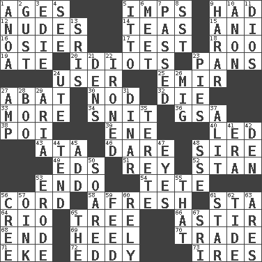 ACROSS 1. Ripens 5. Naughty children 9. Possessed 12. Unadorned figures 14. Beverages made from leaves 15. Cuckoo 16. Flexible twig of a willow tree 17. Trial 18. Friend of Pooh 19. Had dinner 20. Foolish or stupid persons 23. Baking dishes 24. One who uses or employs something 25. Arab leader 27. Blind as ____ 30. Lower and raise head in agreement 32. Pass on 33. Greater amount 34. In a ____ (agitated or irritated) 36. Girls' org. (abbr.) 38. Luau course 39. Compass dir. 40. Directed 43. _ moment's notice (2 wds.) 46. Have the gumption 48. Father 49. Begley and Asner 51. Marina Del _, California 52. Comedian Laurel of Laurel & Hardy 53. Inside; within (prefix) 54. Wig 56. Drawstring 58. Anew 61. R.R. building 64. River (Sp.) 65. Woody plant 66. Moving or stirring 68. Conclude 69. Person who is morally reprehensible 70. Exchange 71. Make supply last 72. Whirlpool 73. Angers DOWN 1. Small Philippine buffalo 2. Abrupt rush of wind 3. Singer Brickell 4. Perceive with the eye 5. "Tell ____ the Marines!" 6. Confront 7. Went by 8. Fast jet (abbr.) 9. Ethiopian city, capital of Harari 10. Soon (poet.) 11. "Vaya con ____" 13. Indian titles of respect 21. Habitations of wild animals 22. Pressed 23. Sliced desserts 24. Shoshoni 26. Russian fighter aircraft 27. Electrical Unit 28. Oct. 31 cry 29. Operatic vocal solo 31. Middle Eastern gold or silver currency 35. Cylindrical with tapered ends 37. Set down 41. Period 42. Lair 44. Watch over 45. Say or write further 47. Snake ____ (dice throw) 48. Compass dir. 50. Flew 53. Eat (away) 55. Not this but _ 56. Algonquian 57. Pig sound 59. Nourish 60. Have trust in 61. Play the lead 62. Event that recurs at intervals 63. Ancient Greek god of war 65. Definite Article 67. _ Lanka