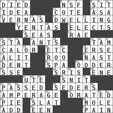 ACROSS 1. Passed on 5. Overdraft (abbr.) 8. Be seated 11. The content of cognition 12. ____ d'Azur (French Riviera) 13. White ___ sheet 14. Actresses Bloom and Felton 17. Residence 19. Gossips 21. Opts 22. Oceans 23. Actress Charlotte 24. R.R. building 27. Pismires 29. Scottish cap 32. Bodily heat indicating an inflammation 34. And so on (abbr.) 36. Celtic language 37. Set down 38. Friend of Pooh 39. Political cartoonist Thomas 40. Gouge 41. Health resort 42. More peculiar 43. Compass dir. 44. Indian titles of respect 46. Compass dir. 47. Shoshoni 50. In a ____ (agitated or irritated) 52. Went by 55. Spring feasts 57. Electrical Measurement 59. Declaimed 62. Sliced dessert 63. Narrow board 64. Undercover agent 65. Find the sum of 66. Car or cant ending 67. Ache DOWN 1. HTML Container Element 2. Binary compound 3. Suggestive of the supernatural 4. Natives or inhabitants of Denmark 5. At this time 6. Navigate 7. Man or boy (slang) 8. Ketch in the Levant 9. Is not 10. Labels 12. Music discs 15. Approach 16. Comedian Laurel of Laurel & Hardy 18. Area sheltered from the wind 20. Michaelmas daisies 24. Tons 25. Lies 26. Place in a line 28. Obstructs or blocks passage 29. Buy and sell 30. NE Netherlands city 31. Distance measurement (Brit.) 33. Baseball player Mel 35. Unrefined 36. Conclude 42. Flexible twig of a willow tree 45. _ china 47. Purpose 48. Laconic 49. Peak District village in England 51. _____ steamer (cargo ship) 52. Dad 53. Among 54. Moved rapidly 55. Arrange properly for use 56. Portico 58. Separate the seeds from cotton 60. Connecticut Ivy Leaguer 61. Lair