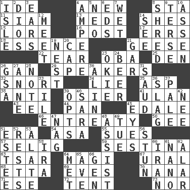 ACROSS 1. Binary compound 4. Afresh 8. R.R. building 11. Thailand, formerly 13. Ancient Persian 14. "______ My Girl" (Turtles hit) 15. Old wives' tales, e.g. 16. Mail 17. Blunders 18. Core 21. Honkers 22. Pull into pieces 23. Chief or king in Benin or Nigeria 25. Lair 26. Separate the seeds from cotton 29. Orators 32. Derisive sound 34. Whopper 35. Viper 38. Against 39. Flexible twig of a willow tree 41. Uhlan (variant) 43. Snakelike fish 44. Baking dish 45. Peak District village in England 46. Plea 50. Turn to the right 51. Epoch 54. White ___ sheet 55. Institutes legal proceedings 57. Major League Baseball Commissioner Bud 59. French poetic form 63. Russian ruler of old 64. Wise men 67. Mountain range 68. Singer James 69. Nights before holidays 70. Nanny 71. Compass dir. 72. Portable shelter 73. And not DOWN 1. Small island 2. "Vaya con ____" 3. Hearing organs 4. Electrical Unit 5. Modern: prefix 6. Begley and Asner 7. Soggy 8. Tear up 9. Laconic 10. NE Netherlands city 12. Rendezvous 14. Observe 19. Egg locale 20. Head covering 21. Slender fish 23. Migrant worker of the '30s 24. Fermented drink made from hops 26. Girls' org. (abbr.) 27. Singer Murray 28. Short letter 30. Place in a line 31. Saudi Arabian king (1953-1964) 33. Cause heat under the collar 36. Volcanic refuse 37. Diluted with white 39. Chooses 40. "Two Mules for Sister ____" 42. Born 45. Sight organs 47. Tired old horse 48. Aid 49. Third day of the wk. 51. First name in cosmetics 52. Musical pauses 53. Having winglike extensions 56. Astound 58. Retirement account (abbr.) 60. SW Asia republic 61. Billionth: prefix 62. Having or resembling wings 64. Was introduced to 65. "___ Maria" 66. Commissioned military rank (abbr.)