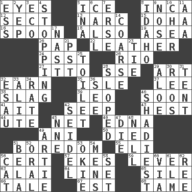 ACROSS 1. Snake ____ (dice throw) 5. Frozen water 8. South American Indian 12. Religious group 13. Drug cop 15. Capital of the state of Qatar 16. Soup utensil 18. In addition 19. Toward the sea 20. Infant food 22. Cordwainer's material 24. Inconspicuous attention getter 26. River (Sp.) 27. "Tell ____ the Marines!" 28. Compass dir. 29. Nonscientific branch of learning 32. Merit 35. Capri or Wight 37. Area sheltered from the wind 38. Volcanic refuse 39. Lion 40. Within a short period 41. Small island 42. Ooze 43. Behest 44. Shoshoni 45. Remaining after all deductions 46. Pulitzer Prize-winning author Ferber 49. Cuckoo 50. Passed on 51. Mood resulting from idleness 55. Connecticut Ivy Leaguer 56. An absolute certainty 57. Supplements with great effort 59. Prying instrument 63. Mountain range southwest of Kyrgyzstan 64. Actor's bit 65. Drop; flow; fall 66. Story 67. Eastern Standard Time (abbr.) 68. Not wild DOWN 1. Curvy letter 2. Slangy assent 3. Environmental prefix 4. Halting 5. _ tizzy (2 wds.) 6. Give a ring to 7. Celtic language 8. Potato state 9. Characteristic smell of wine 10. "Mermaids" star 11. American Automobile Association (abbr.) 14. Unrefined 17. Political cartoonist Thomas 21. Pacific Standard Time (abbr.) 23. Standoff 25. Rest room 28. Inclined 29. _ vera 30. Vintage cars 31. Portable shelter 32. He sold his birthright 33. Set down 34. Assign a rank or rating to 36. Observe 40. Most questionable 42. Beer mug 45. Compass dir. 47. Pass on 48. 1994 drama film starring Jodie Foster 49. Nick name for Arthur 51. Actor Lugosi 52. Taken by mouth 53. Migrant worker of the '30s 54. Not women's 56. Feline 58. Put into a specified state 60. By way of 61. Shade tree 62. To sift