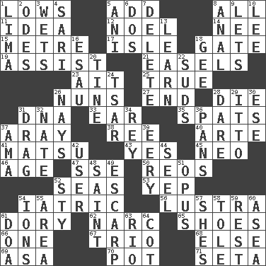 ACROSS 1. Coldest temperatures 5. Find the sum of 8. 100% 11. The main thing one is thinking about 12. Christmas carol 14. Born 15. Distance measurement (Brit.) 17. Capri or Wight 18. Yard entry 19. Help 21. Artist's stands 23. Small island 25. Loyal 26. Religious women 27. Conclude 28. Expire 31. Heredity factor (abbr.) 33. Ewer handle 35. Arguments over trivial matters 37. Like ___ of sunshine 38. To separate or throw off 40. Johnson of "Laugh-In" 41. Taiwanese island in East China Sea 43. Affirmative reply 45. Modern: prefix 46. Ripen 47. Compass dir. 50. Vintage cars 52. Oceans 53. Slangy assent 54. Of or pertaining to medicine 56. A period of five years 61. Small, narrow, flatbottom fishing boat 62. Drug cop 65. Imelda's hoard 66. Single 67. Musical group of three 68. Otherwise 69. White ___ sheet 70. Cooking vessel 71. Bristle DOWN 1. Pale green bean 2. Lyric poems 3. Moistens 4. Indian skirt 5. Black tropical American cuckoo 6. Two (Sp.) 7. Erase 8. Of or related to the anus 9. Allows 10. Area sheltered from the wind 13. Acquire or gain knowledge or skills 16. Son of Isaac 18. Unit of force equal to gravity 20. Prong on a fork 22. Beer foam 24. Russian ruler of old 26. Negative votes 28. Have the gumption 29. "Tell ____ the Marines!" 30. Compass dir. 31. To draw with force 32. Nathan's nickname 34. Marina Del _, California 36. Baking dishes 37. Housemaid (var.) 39. Suggestive of the supernatural 42. One who makes use of a thing 44. Sew up the eyelids of hawks and falcons 48. Inhabitant of Heaven 49. Fortification 51. Musical composition 52. Filthy place 54. Charged atoms 55. Type of rug 57. "______ My Girl" (Turtles hit) 58. Lacquered or enameled metalware 59. Remainder 60. Toward the sea 61. ___ good deed 63. River (Sp.) 64. Small bed