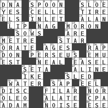 ACROSS 1. Heredity factor (abbr.) 4. Soup utensil 9. _ gin 13. Consenting reply 14. Cell (Danish) 15. Become fatigued 16. Raised railways 17. An arm off of a larger body of water 18. ____ Jay Lerner 19. Mouth edge 21. Tired old horse 22. Person of subnormal intelligence 24. Sty mamas 26. "We ___ not amused" (Victoria) 27. Distance measurement (Brit.) 29. Play the lead 30. Declaim 31. Grows older 33. Hit sharply and swiftly 36. Spanish title 37. Son of Zeus who helped slay Medusa 40. Australian flightless bird 41. Eastern Standard Time (abbr.) 42. Anneal 43. Artist's stand 45. Stalk of a moss capsule 47. Place in a line 48. Eisenhower's nickname 49. Downhill vehicle 50. Wetness 52. Plant excrement 54. Snakelike fish 56. Plate 57. Of or pertaining to a thread or threads 59. Not either 61. Butter sub 62. Having winglike extensions 63. Accounting whiz (abbr.) 64. First of billions? 65. Annoying sound 66. Compass dir. DOWN 1. Color 2. 1994 drama film starring Jodie Foster 3. Helper 4. _-fi 5. Actor Sean's family 6. Rounded earthenware pot or jar 7. Cassini of fashion 8. Remaining after all deductions 9. A viewer who gazes fixedly 10. _ and Stitch 11. Northwest Algerian city 12. Car or cant ending 20. Left side of a ship or aircraft 22. Taiwanese island in East China Sea 23. Mouth or opening 25. Shed a tear 27. Method 28. Greek god of love 29. Stitch closed the eyes of (a falcon) 31. Type of rug 32. Girls' org. (abbr.) 33. Home 34. So be it 35. Whimper 38. Keyboard key 39. Lick closed 44. Toward shelter 45. "Cheers" or "Ellen" 46. Make supply last 49. Arguments over trivial matters 50. Rampant 51. At sea 52. Grain storage tower 53. Jai ____ 55. Chops off 56. ___ good deed 57. Avid follower 58. To riddle 60. Actress Charlotte