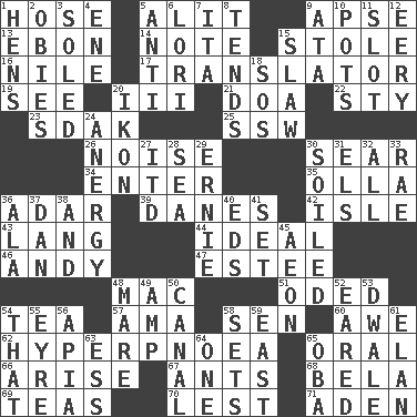 ACROSS 1. Flexible conduit 5. Came down and settled, as after flight 9. Domed church section 13. Inky black, to poets 14. Brief written record 15. Fur scarf 16. "Death on the ____" 17. Interpreter 19. Observe 20. One more than two 21. ___ good deed 22. Filthy place 23. Neighbor of Neb. 25. Compass dir. 26. Annoying sound 30. Scorch 34. Keyboard key 35. Spanish pot 36. The sixth month of the Jewish calendar 39. Natives or inhabitants of Denmark 42. Capri or Wight 43. Austrian-born American filmmaker Fritz 44. Standard of perfection 46. "60 Minutes" Commentator Rooney 47. First name in cosmetics 48. Apple computer (short form) 51. Wrote a lyric poem 54. Beverage made from leaves 57. Wet nurse (var.) 58. Elected rep. 60. Deep reverence 62. Abnormally rapid or deep breathing 65. Of the mouth 66. Get up 67. Pismires 68. Actor Lugosi 69. Afternoon social gatherings 70. For fear that 71. Arabian gulf DOWN 1. Coop moms 2. Off-Broadway awards 3. Having a sole or soles 4. Compass dir. 5. Against 6. Australian parrot (variant) 7. Call ___ day 8. Watches over 9. _ moment's notice (2 wds.) 10. Plant holders 11. Slit 12. Suggestive of the supernatural 15. Cole _ (cabbage dish) 18. Distress signal 20. Visual representation of an object 24. Disorder of the immune system 27. It would 28. Ocean 29. Bert's buddy 30. Dirtied 31. Raised railways 32. Everything 33. Actress Charlotte 36. Chicken ___ king 37. One of the 12 tribes of Israel 38. Plus 40. Begley and Asner 41. Put into a specified state 45. Period of immesurable duration 48. Female horse 49. Electrical Unit 50. Lessep's creation 52. Having ears or earlike features 53. A sleeping potion; an opiate (poet.) 54. Not this but _ 55. Jane of fiction 56. Capital of Western Samoa 58. Puts into a specified state 59. 90 degrees 61. Flair 63. Double-curved letter 64. Single 65. Chief or king in Benin or Nigeria