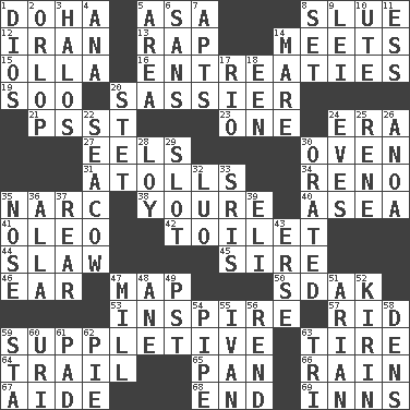 ACROSS 1. Capital of the state of Qatar 5. White ___ sheet 8. Turn sharply 12. SW Asia republic 13. Hit sharply and swiftly 14. Confronts 15. Water jar 16. Pleas 19. "Barney Miller" actor Jack 20. More lively and spirited 21. Inconspicuous attention getter 23. Single 24. Period 27. Snakelike fish 30. Baking chamber 31. Ringlike coral islands and reefs 34. Western Nevada city 35. Drug cop 38. You are 40. Toward the sea 41. Butter sub 42. Rest room 44. Cole _ (cabbage dish) 45. The founder of a family 46. Ewer handle 47. Atlas unit 50. Neighbor of Neb. 53. Motivate 57. To free from 59. Supplementary 63. Become fatigued 64. Hang back 65. Baking dish 66. Water falling in drops from the sky 67. Assistant 68. Conclusion 69. Taverns DOWN 1. "Vaya con ____" 2. Fourth or lowest deck 3. Saint headwear 4. Santa ___, CA 5. Length times width 6. Without 7. Tenement units (abbr.) 8. Put into a specified state 9. Luau accessory 10. Shoshoni 11. Double-curved letter 14. Female horse 17. River (Sp.) 18. Car or cant ending 20. Proofreading order 22. Manatee 24. Nights before holidays 25. French philosopher Descartes 26. Small Philippine buffalo 28. Myrna of the movies 29. Narrow opening 30. Spoke pompously 32. Nilotic language 33. Indian titles of respect 35. Sense of smell 36. Silent film actress Nazimova 37. Located in or toward the back 39. Biblical high priest 43. Celtic language 47. Place where flour is made 48. One (Scot) 49. Pacific Standard Time (abbr.) 51. Believer in; advocate of (suffix) 52. Japanese brewing company 54. Corncob 55. "Terrible" tsar 56. Tear apart 58. Habitations of wild animals 59. R.R. building 60. RI univ. 61. Writing tablet 62. Sliced dessert 63. Three (prefix)