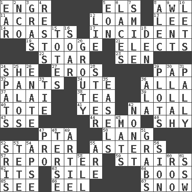 ACROSS 1. Engineer (abbr.) 5. Raised railways 8. Leather borer 11. Land measure 12. Rich soil 13. Area sheltered from the wind 14. Exposes to great heat 17. Happening 19. Moe Howard, for one 21. Opts 22. Play the lead 23. Elected rep. 24. A female animal or person 27. Greek god of love 29. Infant food 32. Leg coverings 34. Shoshoni 36. Silent film actress Nazimova 37. Jai ____ 38. Beverage made from leaves 39. Hang loosely or laxly 40. Carry 41. Consenting reply 42. Brizilian seaport 43. Compass dir. 44. San ____ (Riviera town) 46. Like a shrinking violet 47. Parent Teacher Association (abbr.) 50. Austrian-born American filmmaker Fritz 52. A viewer who gazes fixedly 55. Michaelmas daisies 57. News announcer 59. Flight of steps 62. It is 63. Drop; flow; fall 64. Scornful sounds 65. Perceive with the eye 66. Snakelike fish 67. Overwhelm DOWN 1. Hearing organ 2. Non-commissioned officer (abbr.) 3. Pate de foie ____ 4. Musical pauses 5. Period of immesurable duration 6. Shoestrings 7. Grin 8. Actor Baldwin 9. Left 10. Allows 12. Whopper 15. Hauls 16. Fly high 18. Lair 20. Cross 24. Arguments over trivial matters 25. Radiant circles of light 26. Maternal 28. Navigate 29. Small pieces of grounds 30. Assad's deity 31. Friendly 33. Neckwear 35. Artist's stands 36. According to 42. Music written for nine 45. Floor protectors 47. Adept person 48. Laconic 49. Nick name for Arthur 51. Seizes 52. Indian titles of respect 53. Wig 54. Domed church section 55. "We ___ not amused" (Victoria) 56. The Jewish people; Israel 58. Pipe bend 60. Friend of Pooh 61. Compass dir.