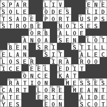 ACROSS 1. Practice fight 5. 54 in ancient Rome 8. Compass dir. 11. Not divided or shared with others 12. Lyric poems 14. Hat (slang) 15. Sadhe (variant) 17. Left side of a ship or aircraft 18. United States Postal Service (abbr.) 19. Disco prop 21. Annoying sounds 23. Globe 25. _ vera 26. Small Philippine buffalo 27. Elected rep. 28. Car dealer's back yard 31. Benjamin's nick name 33. Indian title of respect (Mr.) 35. Not moving 37. Style 38. Be seated 40. Actor Baldwin 41. Failure 43. Lyricist Gershwin 45. Friend of Pooh 46. Frozen water 47. Snakelike fish 50. Prepare for publication 52. Single time 53. Krazy ___ of comics 54. Food allowance for one day 56. Makes clutter 61. Draw slowly or heavily 62. Old wives' tales, e.g. 65. Intended 66. Had dinner 67. One of the Great Lakes 68. Helper 69. Affirmative reply 70. A really long time 71. Native of Scotland DOWN 1. Fast planes 2. Mail 3. Having or resembling wings 4. Do over again 5. Trim (branches) 6. Wedding promise 7. Actresses Bloom and Felton 8. Otherwise 9. Pinches, bites 10. Begley and Asner 13. Fur scarf 16. Inky black, to poets 18. Purpose 20. Greek god of love 22. Charged atoms 24. Drinking establishments 26. Singer Murray 28. _ and Stitch 29. Margarine 30. Affectionate concern, for short 31. Coalition 32. Comfort 34. One more than two 36. Small pie 37. Connecticut Ivy Leaguer 39. Long journey 42. Painter Guido (1575-1642) 44. First of billions? 48. Learning spot: Fr. 49. Poe poem 51. A whole individual unit 52. Baseball player Mel 54. Assign a rank or rating to 55. Ancient Greek god of war 57. Oceans 58. Ketch in the Levant 59. Inside; within (prefix) 60. Proofreading order 61. Island 63. _ de Janeiro 64. Car or cant ending