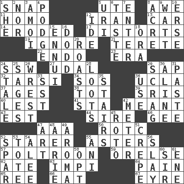 ACROSS 1. Fastener 5. Shoshoni 8. Deep reverence 11. Like (prefix) 12. SW Asia republic 13. Auto 14. Eaten away 17. What propaganda does 19. Snub 21. Cigar-shaped 22. Inside; within (prefix) 23. Period 24. Compass dir. 27. Hereditary estate 29. Plant excrement 32. Tarsus (plural) 34. Mayday 36. Southern CA. univ. 37. Matures 38. Small child 39. Indian titles of respect 40. For fear that 41. R.R. building 42. Intended 43. Eastern Standard Time (abbr.) 44. The founder of a family 46. Turn to the right 47. American Automobile Association (abbr.) 50. College mil. group 52. A viewer who gazes fixedly 55. Michaelmas daisies 57. Characterized by complete cowardliness 59. Threatening words 62. Had dinner 63. Body of Kaffir warriors 64. Ache 65. To separate or throw off 66. Consume 67. Jane of fiction DOWN 1. A female animal or person 2. And not 3. Mine, in Marseilles 4. Plash 5. RI univ. 6. Clothes sense 7. Keyboard key 8. Land measure 9. Electrical Unit 10. Celtic language 12. Binary compound 15. World-weariness 16. Texas town _ City 18. Mouth or opening 20. Ridicules or criticizes harshly 24. Having lost freshness 25. Gurus 26. Obtain by seizing forcibly or violently 28. Plunders 29. Strangle with an iron collar 30. Place in a line 31. Thick mixture 33. Fast jet (abbr.) 35. Flight of steps 36. Purpose 42. Distance measurement 45. Printing process, for short 47. Nonscientific branch of learning 48. Nest on high 49. Odor 51. Streamer paper 52. Practice fight 53. Haul 54. Toward shelter 55. Black tropical American cuckoo 56. Kill 58. Choose 60. Title for a knight 61. Compass dir.