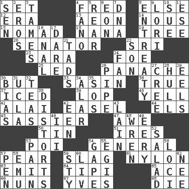 ACROSS 1. Arrange properly for use 4. Flintstone 8. Otherwise 12. Epoch 13. Period of immesurable duration 14. Horse sense 15. Wanderer 18. Grandmother 19. Family _ (genealogy) 20. Elected representative 22. Indian title of respect (Mr.) 23. "Two Mules for Sister ____" 24. Enemy 25. Directed 26. Flamboyance 30. With the exception that 33. Indian antelope 36. Loyal 37. On the rocks 39. Trim (branches) 40. Shout 41. Mountain range southwest of Kyrgyzstan 42. Artist's stand 44. Raised railways 45. More disrespectful 47. Deep reverence 50. Shallow baking pan 51. Angers 53. Luau course 54. Commissioned military rank 57. Lightbulb-shaped fruit 59. Volcanic refuse 61. High-strength synthetic material 63. Send forth 64. Native american tent (variation) 65. Adept person 66. Religious women 67. Jacques Cousteau's middle name 68. Expire DOWN 1. Elected rep. 2. Greek god of love 3. Softens 4. Papal veil 5. Tail end 6. A really long time 7. Heredity factor (abbr.) 8. Plea 9. Australian parrot (variant) 10. Institute legal proceedings 11. Compass dir. 16. Of or related to the anus 17. Have the gumption 21. Bits 22. Manchild 24. Avid follower 26. Corncob 27. Algonquian 28. Frame or body of a ship 29. Snakelike fish 30. Prejudice 31. Southern CA. univ. 32. Beverages made from leaves 34. Having or resembling wings 35. Mayday 38. What propaganda does 42. Car or cant ending 43. (Had) reclined 46. One more than two 48. Songbird 49. Suggestive of the supernatural 52. First course 53. Ache 54. Open wide 55. The front part of a cuirass 56. Locales 57. Fenced enclosure 58. Australian flightless bird 59. Filthy place 60. 54 in ancient Rome 62. Born