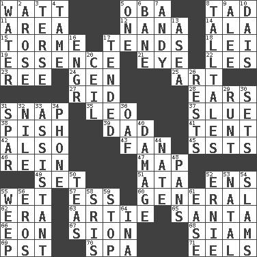 ACROSS 1. Electrical Unit 5. Chief or king in Benin or Nigeria 8. Small amount or degree 11. Length times width 12. Grandmother 14. Chicken ___ king 15. Singer Mel 17. Watches over 18. Flowery wreath 19. Center 21. Sight organ 22. French article 23. To separate or throw off 24. Commissioned military rank (abbr.) 25. Tate display 27. To free from 28. Hearing organs 31. Fastener 35. Lion 37. Turn sharply 38. Expression of disdain 39. Male parent 41. Portable shelter 42. In addition 43. Avid follower 45. Fast planes 46. It's straight from the horse's mouth 47. Atlas unit 49. Arrange properly for use 51. "One Day ___ Time" 52. Followers of ems 55. Dripping 57. Double-curved letter 60. Commissioned military rank 62. Epoch 63. Nick name for Arthur 65. Before Barbara or Clara 66. A really long time 67. The Jewish people; Israel 68. Thailand, formerly 69. Pacific Standard Time (abbr.) 70. Health resort 71. Snakelike fish DOWN 1. Wetness 2. Came up 3. Laconic 4. Not wild 5. Single 6. Object of repulsion 7. Actor Griffith 8. Baron Munchausen's specialties 9. Toward shelter 10. Raised platform 13. At sea 16. Engineer (abbr.) 17. Looked after 20. To provide with a ceiling 26. Musical pauses 29. The smallest animal of a litter 30. Arranges properly for use 31. Practice fight 32. Mediterranean tributary 33. Helper 34. Give a jingle 36. Clumsy lout 40. Break 44. Nathan's nickname 48. Zero-star reviews 50. Afternoon social gatherings 52. Bert's buddy 53. Relating to or accompanying birth 54. Hits or strikes with great force 55. Shed a tear 56. Greek god of love 58. Indian titles of respect 59. Close up, plug up 61. Comfort 64. _ tizzy (2 wds.)