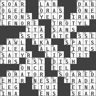 ACROSS 1. Fly high 5. Experiment locale 8. Apply (a substance) by light strokes 11. Double curve, resembling the letter S 12. Mouths or openings 14. Single 15. Metal shackles 17. Sharp bark 18. SW Asia republic 19. Poe poem 21. Trinitrotoluene 23. Call ___ day 25. Without 26. Fast planes 27. Had dinner 28. Compass dir. 31. Leather borer 33. Alias (abbr.) 35. Arguments over trivial matters 37. Entreaty 38. Insect wing 40. Angers 41. Man with strong sexual desires 43. Mouth edge 45. Teat (slang) 46. Big collection agency 47. Eastern Standard Time (abbr.) 50. Food container 52. Single time 53. Snakelike fish 54. Speaker 56. Flew 61. Independent ruler or chieftain 62. Soft 65. Exchange 66. Part of a journey 67. Needle holder 68. Inactive volcano in Sicily 69. _ tizzy (2 wds.) 70. Followers of ems 71. Burn superficially DOWN 1. Earth 2. Legendary monster 3. A really long time 4. Western Nevada city 5. Myrna of the movies 6. "We ___ not amused" (Victoria) 7. Greek mezzo-soprano Agnes 8. Rowboat 9. Of or related to the anus 10. Benjamin's nick name 13. Small fatty European fish 16. Indian titles of respect 18. It is 20. Singer James 22. Washington bills 24. "____ silly question..." 26. Kill 28. Indian skirt 29. Proofreading order 30. Double-curved letter 31. Having or resembling wings 32. Soaks 34. 100% 36. Heart or essence 37. Air pressure measure (abbr.) 39. Helper 42. Monthly bill 44. Sliced desserts 48. Biscuitlike quick bread 49. Cigar-shaped 51. Position in a hierarchy or organization 52. Rowing implement 54. Sign of something about to happen 55. Capital of Latvia 57. Ancient Greek god of war 58. Pace 59. Pulitzer Prize-winning author Ferber 60. Letter starter 61. Connecticut Ivy Leaguer 63. Player for Phoenix 64. Part of HMS, perhaps