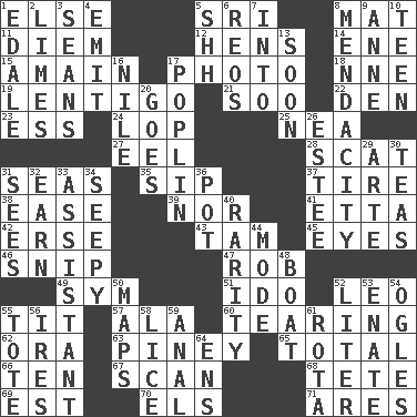 ACROSS 1. Otherwise 5. Indian title of respect (Mr.) 8. Floor covering 11. South Vietnam president (1954) 12. Coop moms 14. Compass dir. 15. With great haste 17. Picture 18. Compass dir. 19. Small, flat, pigmented spot on the skin 21. "Barney Miller" actor Jack 22. Lair 23. Curvy letter 24. Trim (branches) 25. Teachers' org. 27. Snakelike fish 28. Leave at once 31. Oceans 35. Small drink 37. Become fatigued 38. Relaxation 39. And not 41. Singer James 42. Celtic language 43. Scottish cap 45. Snake ____ (dice throw) 46. Clip 47. Director Reiner 49. Symbol (abbr.) 51. Wedding promise 52. Lion 55. Teat (slang) 57. Insect wing 60. Rending 62. Mouth or opening 63. Abounding in pines 65. "_____ Recall" 66. "___ Little Indians" 67. Skim 68. False hair 69. Eastern Standard Time (abbr.) 70. Raised railways 71. Ancient Greek god of war DOWN 1. Peak District village in England 2. Citrus fruits 3. Actors Connery and Penn 4. Give off 5. Quiet! 6. Vintage cars 7. To the inside or interior of 8. Ananias' fault 9. Queen of England 1702-14 10. Adolescent 13. Within a short period 16. "Death on the ____" 17. Cotton for raincoats, e.g. 20. Moves 26. First name in cosmetics 29. Johnson of "Laugh-In" 30. Afternoon social gatherings 31. Perceives with the eye 32. Merit 33. Aide 34. Oozy 36. Plant holder 40. Noteworthy scarcity 44. Method 48. Water vessel 50. Atlas contents 52. 61 cubic inches 53. Related on the mother's side 54. Stares 55. Carry 56. Angers 58. Louse (plural) 59. Of or related to the anus 61. Roll call or roster of names 64. Followers of ems