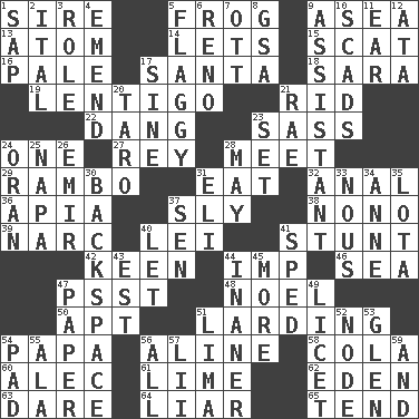 ACROSS 1. The founder of a family 5. Tree-dwelling hopper 9. Toward the sea 13. Tiny particle 14. Allows 15. Go away! 16. Light colored 17. Before Barbara or Clara 18. "Two Mules for Sister ____" 19. Small, flat, pigmented spot on the skin 21. To free from 22. Mild oath, euphamism for damn 23. Backtalk 24. Single 27. Marina Del _, California 28. Rendezvous 29. Role for Stallone 31. Erode 32. Of or related to the anus 36. Capital of Western Samoa 37. Insidious 38. Words to Nanette 39. Drug cop 40. Flowery wreath 41. Check the growth or development of 42. Peachy ____! 44. Mischievous child 46. Ocean 47. Inconspicuous attention getter 48. Christmas carol 50. Fitting 51. Preparing or cooking with lard 54. Dad 56. Place in a line 58. Root beer relative 60. Actor Baldwin 61. Citrus frut 62. Genesis locale 63. Have the gumption 64. One who doesn't tell the truth 65. Be inclined (to) DOWN 1. Plant excrement 2. Slanted text style (abbr.) 3. Hero or heavy, e.g. 4. Make improvements or corrections to 5. Tasteless 6. Western Nevada city 7. Baseball player Mel 8. Girls' org. (abbr.) 9. Helper 10. Oodles 11. Ewer handle 12. _ moment's notice (2 wds.) 17. Trig term 20. Edible starchy tuberous root 21. Actress Charlotte 23. Put into a specified state 24. Northwest Algerian city 25. California wine valley 26. Arab leader 28. Can I? 30. Keyboard key 31. Biblical high priest 33. Good sense 34. Queen of England 1702-14 35. Globular water bottle used in Asia 37. Elected rep. 40. Allow 41. Hurried 43. Eastern Standard Time (abbr.) 44. More lacking in sense or substance 45. Greater amount 47. Some stationery 49. It is permitted: Lat. 51. Pale green bean 52. Thickened enlargement 53. Small, secluded valley 54. Groovy apt. 55. Insect wing 56. 100% 57. Cards in a Roman deck? 59. Plus