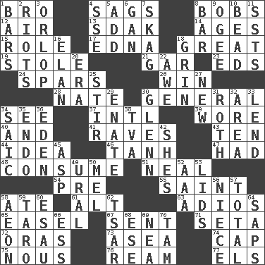 ACROSS 1. Sis' sibling 4. Sinks 8. Moves up and down 12. Wind 13. Neighbor of Neb. 14. Eons 15. Hero or heavy, e.g. 17. Pulitzer Prize-winning author Ferber 18. Relatively large 19. Fur scarf 21. Slender fish 23. Begley and Asner 24. Practice fights 26. Victory 28. Nathan's nickname 30. Commissioned military rank 34. Perceive with the eye 37. International (abbr.) 39. Had on 40. Plus 41. All-night dance parties 43. "___ Little Indians" 44. It may be bright or harebrained 46. Hyperbolic tangent 47. Possessed 48. Ingest 51. Actress Patricia 54. Before (prefix) 55. Inhabitant of Heaven 58. Had dinner 61. The first octave above the treble staff 63. Goodbye (Sp.) 65. Artist's stand 67. Transmitted 71. Bristle 72. Mouths or openings 73. Toward the sea 74. Head covering 75. Horse sense 76. 480, 500 or 516 sheets of paper 77. Raised railways DOWN 1. Oblong pieces of solid material 2. Debaucheries 3. Fourth or lowest deck 4. Compass dir. 5. Find the sum of 6. Separate the seeds from cotton 7. Heroin 8. Long, evenly shaped piece 9. Double curve, resembling the letter S 10. Necklace unit 11. Fast planes 16. Style 18. Broad smile 20. Epoch 22. Deep reverence 25. Move through with a circular motion 27. ___ Haven, CT 29. Maternal 30. American astronaut and politician John 31. Writer of Portnoy's Complaint (1969) 32. Length times width 33. Grant temporary use of 34. Ketch in the Levant 35. Inside; within (prefix) 36. Locale of original sin 38. Federal power corp. 42. "______ My Girl" (Turtles hit) 45. Cleo's killer 49. Mountain range 50. Cartoonist voice _ Blanc 52. Auto club (abbr.) 53. Flaplike coverings 56. Sibling's daughter 57. "_____ Recall" 58. A really long time 59. Edible starchy tuberous root 60. Son of Isaac 62. Russian ruler of old 64. Plant excrements 66. Double-curved letter 68. Compass dir. 69. Teachers' org. 70. Scottish cap
