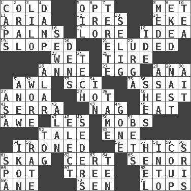 ACROSS 1. Having a low temperature 5. Elect 8. Was introduced to 11. Operatic vocal solo 12. Angers 14. Supplement with great effort 15. Insides of hands 17. Old wives' tales, e.g. 18. The main thing one is thinking about 19. Inclined 21. Evaded 23. Soggy 25. Become fatigued 26. Singer Murray 27. Oval reproductive body of a fowl 28. Santa ___, CA 31. Leather borer 33. _-fi 35. Slender Brazilian palm 37. Small Philippine buffalo 38. Being at a high temperature 40. Command 41. Spanish missionary in California 43. Tired old horse 45. Erode 46. Deep reverence 47. French article 50. Disorderly crowds 52. Story 53. Compass dir. 54. Pressed 56. Principles of right and wrong 61. Heroin 62. Foregone conclusion 65. Sir (Sp.) 66. Plant holder 67. Woody plant 68. Needle case 69. One (Scot) 70. Elected rep. 71. Chops off DOWN 1. Smile enhancers 2. Spoken 3. _ and Stitch 4. Moist 5. Petroleum 6. Adept person 7. Cylindrical with tapered ends 8. Ancient Persian 9. Made supply last 10. Beverage made from leaves 13. Major League Baseball Commissioner Bud 16. Stitched 18. Binary compound 20. Habitations of wild animals 22. Capital and largest city of Mongolia 24. Technical 26. Having or resembling wings 28. Toward the sea 29. Political cartoonist Thomas 30. Small island 31. Afresh 32. Had on 34. Electrically charged atom 36. "______ My Girl" (Turtles hit) 37. White ___ sheet 39. Docile 42. ____ Jay Lerner 44. Went 48. Choose 49. Spring feasts 51. Stakes 52. Coat; cloak 54. Picture 55. Pace 57. Person who is morally reprehensible 58. To the inside or interior of 59. Clever action or accomplishment 60. Indian titles of respect 61. Health resort 63. To separate or throw off 64. "___ Little Indians"