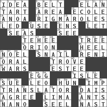 ACROSS 1. The content of cognition 5. Waist strap 9. Style 13. Small pie 14. Type of rug 15. Learning spot: Fr. 16. Small Philippine buffalo 17. Complicated, petty procedures 19. Directed 20. Purpose 21. Followers of ems 22. Allow 23. Oceans 25. Observe 26. Giggle 30. Woody plant 34. Constellation of myth 35. Person who is morally reprehensible 36. Christmas carol 39. Slow-paced one 42. Painter Guido (1575-1642) 43. Taken by mouth 44. Collection of objects 46. Armed conflicts 47. First name in cosmetics 48. Ovum 51. Small island 54. Take to court 57. Lion 58. Attila the _ 60. Mischievous child 62. Interpreter 65. Raised platform 66. Match 67. Pale green bean 68. Pismires 69. Billionth: prefix 70. Stitch closed the eyes of (a falcon) 71. Political cartoonist Thomas DOWN 1. Slanted text style (abbr.) 2. Natives or inhabitants of Denmark 3. Wear away 4. "One Day ___ Time" 5. Soap units 6. One of the Great Lakes 7. Part of a journey 8. Softens 9. Environmental prefix 10. Hang loosely or laxly 11. Toward shelter 12. Egg locale 15. Celtic language 18. One (Scot) 20. One who makes use of a thing 24. Ringlike coral islands and reefs 27. Part of HMS, perhaps 28. Period of immesurable duration 29. Maternal 30. Triplets 31. To sift 32. Car or cant ending 33. Biblical high priest 36. At this time 37. Mouth or opening 38. Hearing organ 40. Big collection agency 41. Car dealer's back yard 45. Distinctive style or manner 48. Otherwise 49. Set 50. Scores awarded for successful feats 52. Woody, climbing, usually tropical plant 53. Gives off 54. Comedian Laurel of Laurel & Hardy 55. Capital and largest city of Mongolia 56. Merit 58. Dwelling 59. Mountain range 61. Inconspicuous attention getter 63. Modern: prefix 64. Make a knot 65. One of the 12 tribes of Israel