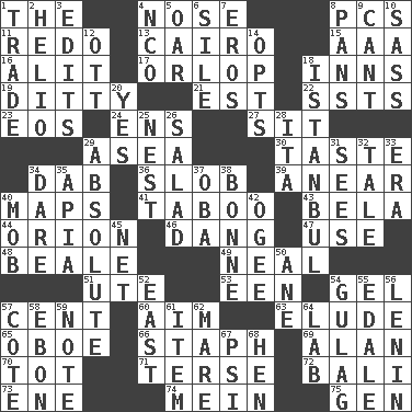 ACROSS 1. Definite Article 4. Characteristic smell of wine 8. Personal Computers (abbr.) 11. Make new 13. Capital of Egypt 15. American Automobile Association (abbr.) 16. Set down 17. Fourth or lowest deck 18. Taverns 19. Short, simple song 21. Eastern Standard Time (abbr.) 22. Fast planes 23. Greek goddess of the dawn 24. Followers of ems 27. Be seated 29. At sea 30. Clothes sense 34. Apply (a substance) by light strokes 36. Oscar Madison type 39. Approach 40. Atlas contents 41. Off limits 43. Actor Lugosi 44. Constellation of myth 46. Mild oath, euphamism for damn 47. Purpose 48. Memphis, Tenn. Street 49. Actress Patricia 51. Shoshoni 53. Car or cant ending 54. Set 57. Penny 60. Direct toward a target or goal 63. Evade 65. Mitch Miller's instrument 66. Staphylococcus 69. Actor Alda or Thicke 70. Small child 71. Laconic 72. Indonesian resort city 73. Compass dir. 74. Chow _ 75. Commissioned military rank (abbr.) DOWN 1. Swap 2. Sun: prefix 3. Prepares for publication 4. Non-commissioned officer (abbr.) 5. Rowing implement 6. Drop; flow; fall 7. Greek god of love 8. Baking dishes 9. Patter 10. Backtalk 12. Baseball player Mel 14. Elects 18. Byzantium, centuries later 20. It is so 25. A home for chicks 26. Vegetable dish 28. Call ___ day 29. Utter; complete 31. Observes 32. Story 33. Epoch 34. Have the gumption 35. Capital of Western Samoa 37. Chief or king in Benin or Nigeria 38. Child's nurse 40. Disorderly crowd 42. Double curve, resembling the letter S 45. Remaining after all deductions 50. One (Scot) 52. 90 degrees 54. Russian prison camp 55. Peak District village in England 56. Soviet premier 1918-24 57. ____ d'Azur (French Riviera) 58. Inky black, to poets 59. Brief written record 61. Detail 62. Female horse 64. Experiment locale 67. 23rd letter of the Greek alphabet 68. Layer