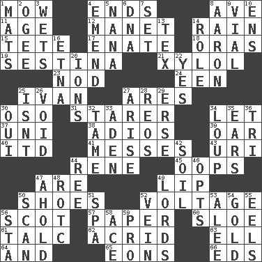 ACROSS 1. Cut the grass 4. Extremities 8. "___ Maria" 11. Personal question 12. French painter Edouard 14. Water falling in drops from the sky 15. False hair 17. Related on the mother's side 18. Mouths or openings 19. French poetic form 21. Xylene (variant) 23. Allow head to fall sleepily 24. Car or cant ending 25. "Terrible" tsar 27. Ancient Greek god of war 30. Bear (Spanish) 31. A viewer who gazes fixedly 34. Allow 37. University (slang) 38. Goodbye (Sp.) 39. Rowing implement 40. It would 41. Makes clutter 43. RI univ. 44. French philosopher Descartes 45. I made a mistake 47. "We ___ not amused" (Victoria) 49. Mouth edge 50. Imelda's hoard 52. Electrical Measurement 56. Highlander 57. Some stationery 60. _ gin 61. Baby powder 62. Bitter 63. Pipe bend 64. Also 65. Immeasurably long periods of time 66. Begley and Asner DOWN 1. Floor coverings 2. Double curve, resembling the letter S 3. Moistens 4. Make improvements or corrections to 5. Nanny 6. Heredity factor (abbr.) 7. Arrange properly for use 8. Composer Copland 9. Small bottle 10. Followers of ems 13. John Ritter's dad 14. Hero or heavy, e.g. 16. Inactive volcano in Sicily 20. Charged particles 22. It is so 25. Is not 26. State of nonexistence 27. Ascend 28. Vintage cars 29. Celtic language 30. Fr. "Yes" 32. Not wild 33. Arabian gulf 34. Central Nebraska county 35. Hearing organs 36. Three (prefix) 42. Earth 44. To riddle 46. Chooses 47. Hold, grip (Informal) 48. College mil. group 49. Nobles 50. Examine hastily 51. Health resort 52. Distinctive style or manner 53. Toward shelter 54. Precious metal 55. Snakelike fish 56. R.R. building 58. Adept person 59. Adept person