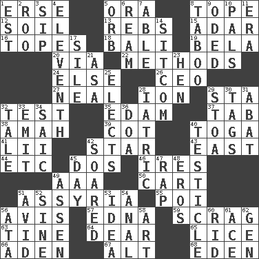 ACROSS 1. Celtic language 5. Mouth or opening 8. Drink excessively 12. Land 13. Confederate soldiers (slang) 15. The sixth month of the Jewish calendar 16. Drinks excessively 18. Indonesian resort city 19. Actor Lugosi 20. By way of 22. Modes 24. Otherwise 26. Corporate head (abbr.) 27. Actress Patricia 28. Electrically charged atom 29. R.R. building 32. Trial 35. Dutch treat 37. Keyboard key 38. Nursemaid 39. Small bed 40. Ancient Roman robe 41. Cards in a Roman deck? 42. Play the lead 43. Compass direction 44. And so on (abbr.) 45. Two (Sp.) 46. Angers 49. American Automobile Association (abbr.) 50. Draw slowly or heavily 51. Nineveh was its capital 55. Luau course 56. Deliberation 57. Pulitzer Prize-winning author Ferber 59. Lean end of the neck 63. Prong on a fork 64. Letter starter 65. Louse (plural) 66. Arabian gulf 67. The first octave above the treble staff 68. Locale of original sin DOWN 1. Eastern Standard Time (abbr.) 2. Friend of Pooh 3. Small drink 4. Veterans Day date 5. Globe 6. 480, 500 or 516 sheets of paper 7. Competent 8. Off limits 9. Wrote a lyric poem 10. Friends 11. Period 14. "Cheers" or "Ellen" 17. Drop; flow; fall 21. White ___ sheet 23. Layer 25. Chooses 28. Of or pertaining to medicine 29. Portico 30. Labels 31. Blind as ____ 32. Falsehood 33. Give off 34. Ketch in the Levant 36. ___ good deed 40. A testis 42. Flew 45. 24 hours 47. Hit sharply and swiftly 48. Greek god of love 49. NE Netherlands city 51. Enthusiastic 52. Trig term 53. The content of cognition 54. Of or related to the anus 56. _ moment's notice (2 wds.) 58. Nonscientific branch of learning 60. To free from 61. Adept person 62. Commissioned military rank (abbr.)