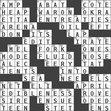 ACROSS 1. Electrical Unit 4. Blind as ____ 8. ____ d'Azur (French Riviera) 12. Pile 14. Make _____ (do battle with) 16. Gumbo ingredient 17. Singer James 18. Pleas 20. Sports stadium 22. Lubricate 23. Newt 24. Spanish title 25. It is 28. Infant locale 30. Prepare for publication 31. Feeling or showing extreme anger 35. Cartoonist voice _ Blanc 37. Tined utensil 40. Singles 41. Method 42. Watery 44. Characteristic smell of wine 45. Actor Baldwin 46. Suggestive of the supernatural 47. Make lace 48. Portable shelters 50. To the inside or interior of 52. Ocean 54. Born 55. Raised railways 58. Fish or hair follower 61. Biblical high priest 63. Showery time 65. The property of being fit to eat 70. Be footloose 71. The founder of a family 72. Take place subsequently 73. Wrote a lyric poem 74. Adolescent 75. Proofreading order 76. Followers of ems DOWN 1. Toward the future 2. Paris' subway 3. Eucharist need 4. Deep reverence 5. Forbid 6. Tate display 7. "Corrida" creature 8. Small bed 9. Migrant worker of the '30s 10. Unclean, religiously 11. 90 degrees 13. Baking dish 15. Famous astronaut Armstrong 19. Jai ____ 21. Help 26. Small quarrel 27. Took without asking 29. Right away 30. Opts 32. Small Philippine buffalo 33. Trial 34. Compass dir. 35. Undercover agent 36. Paradise 38. Regret 39. Japanese brewing company 41. Floor protector 43. Unit of force 49. Sew up the eyelids of hawks and falcons 51. Afternoon social gathering 53. Toward shelter 55. Wear away 56. Make or become more lively 57. Bobsleighs 58. A home for chicks 59. Singer Brickell 60. Become fatigued 62. Lodging establishments 64. Adept person 66. Benjamin's nick name 67. Eastern Standard Time (abbr.) 68. Take to court 69. Arrange properly for use