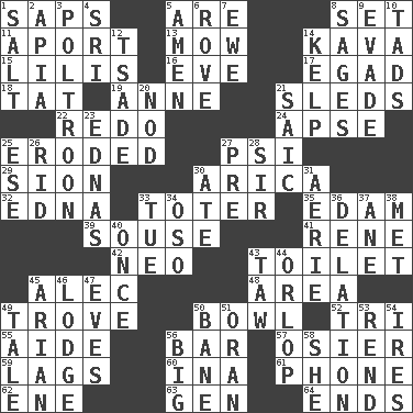 ACROSS 1. Plant excrements 5. "We ___ not amused" (Victoria) 8. Arrange properly for use 11. To the left, to Queeg 13. Cut the grass 14. Polynesian shrub of the pepper family 15. Ms. Damita and namesakes 16. First lady 17. Mild oath 18. Make lace 19. Queen of England 1702-14 21. Bobsleighs 22. Make new 24. Domed church section 25. Worn away 27. Air pressure measure (abbr.) 29. The Jewish people; Israel 30. N. Chile seaport 32. Pulitzer Prize-winning author Ferber 33. Carrier 35. Dutch treat 39. Boozer 41. French philosopher Descartes 42. Modern: prefix 43. Bathroom plumbing fixture 45. Actor Baldwin 48. Type of rug 49. Collection of objects 50. Soup holder 52. Three (prefix) 55. Helper 56. Tavern 57. Flexible twig of a willow tree 59. Straggles 60. _ tizzy (2 wds.) 61. Give a jingle 62. Compass dir. 63. Commissioned military rank (abbr.) 64. Conclusions DOWN 1. Table seasoning 2. Capital of Western Samoa 3. Coward 4. Indian title of respect (Mr.) 5. So be it 6. Be footloose 7. She-sheep 8. Gurus 9. Elude 10. Small amounts or degrees 12. Sadhe (variant) 14. Seaweed 20. Lower and raise head in agreement 21. Ketch in the Levant 23. Ferber et al. 25. Compass dir. 26. To free from 27. Before (prefix) 28. Title for a knight 30. Had dinner 31. Nest on high 33. Third day of the wk. 34. Bear (Spanish) 36. Accusation by an informer 37. A saturated hydrocarbon 38. Was introduced to 40. Single time 43. The 23rd letter of the Hebrew alphabet 44. Lowest deck of a ship 45. Believer in; advocate of (suffix) 46. Inn 47. Nights before holidays 49. Lie 50. Object of repulsion 51. NW Algerian seaport 53. Tear apart 54. Angers 56. Of large size 58. A female animal or person