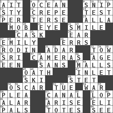 ACROSS 1. Small island 4. Sea 9. Clip 13. Filthy place 14. Streamer paper 15. Trial 16. For each 17. Laconic 18. Silent film actress Nazimova 19. Crowd into 21. Sight organ 22. Grin 24. Keg 26. Hearing organ 27. Poet Dickinson 29. Blunders 30. "The Thinker" sculptor 31. The sixth month of the Jewish calendar 33. Pull behind 36. _ Lanka 37. Devices for capturing images 40. Personal question 41. Car or cant ending 42. Without 43. Promenades 45. Pledge 47. An arm off of a larger body of water 48. What Jean-Claude Killy likes to do 49. Proofreading order 50. Motion picture award 52. Third day of the wk. 54. Armed conflict 56. Entreaty 57. Lessep's creation 59. Chop off 61. Having or resembling wings 62. Ascend 63. Biblical high priest 64. Friends 65. Lugs 66. Observe DOWN 1. Viper 2. A whole individual unit 3. Polypeptide antibiotic 4. Sep. follower 5. Small stream 6. Suggestive of the supernatural 7. Domed church section 8. Born 9. Flight of steps 10. 1994 drama film starring Jodie Foster 11. Small island 12. Parent Teacher Assoc. 20. Indonesian resort city 22. Spanish missionary in California 23. Spoil 25. Synchronize (abbr.) 27. Celtic language 28. Greater amount 29. Hearing organs 31. Housemaid 32. Lair 33. Baron Munchausen's specialties 34. Stare 35. Compass direction 38. Having gotten out of bed 39. Stricken, poetically 44. Afresh 45. Motion picture awards 46. Alias (abbr.) 49. Gospel singer Marvin 50. Rounded earthenware pot or jar 51. Lick closed 52. Pacific island yam 53. A single undivided whole 55. Hero or heavy, e.g. 56. Infant food 57. Domesticated feline 58. French article 60. Sliced dessert