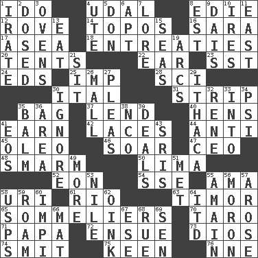ACROSS 1. Wedding promise 4. Hereditary estate 8. Singer Brickell 12. Be footloose 14. Literary convention 16. "Two Mules for Sister ____" 17. At sea 18. Pleas 20. Portable shelters 22. Ewer handle 23. Fast jet (abbr.) 24. Begley and Asner 25. Naughty child 28. _-fi 30. Slanted text style (abbr.) 31. Long narrow piece of something 35. Container for groceries 37. Grant temporary use of 40. Coop moms 41. Merit 42. Shoestrings 44. Against 45. Margarine 46. Fly high 47. Corporate head (abbr.) 48. Excessive but superficial compliments 50. Pale green bean 52. Period of immesurable duration 54. Compass dir. 55. Nursemaid (var.) 58. RI univ. 61. River (Sp.) 63. The easternmost of the Lesser Sundas 65. Wine waiters 70. Pacific island yam 71. Dad 72. Take place subsequently 73. "Vaya con ____" 74. Stricken, poetically 75. Peachy ____! 76. Compass dir. DOWN 1. Feeling or showing extreme anger 2. Administered medicine 3. Baking chambers 4. Shoshoni 5. Spanish title 6. Fitting 7. Old wives' tales, e.g. 8. Eastern Standard Time (abbr.) 9. Raised platform 10. Angers 11. 90 degrees 13. Ingest 15. Oceans 19. Curves 21. Be seated 26. Shopping center 27. Entreaties 29. New York city 30. Dismiss 32. French philosopher Descartes 33. To the inside or interior of 34. 23rd letter of the Greek alphabet 35. Lip ointment 36. Type of rug 38. Non-commissioned officer (abbr.) 39. Allots cards 41. Greek goddess of the dawn 43. Indian titles of respect 49. Greater amount 51. Was introduced to 53. The longest river in the world 55. At full speed 56. Person of subnormal intelligence 57. Came up 58. United States Postal Service (abbr.) 59. Wander 60. Body of Kaffir warriors 62. Pig sound 64. It would 66. Floor protector 67. Compass dir. 68. Sorrow 69. Elected rep.