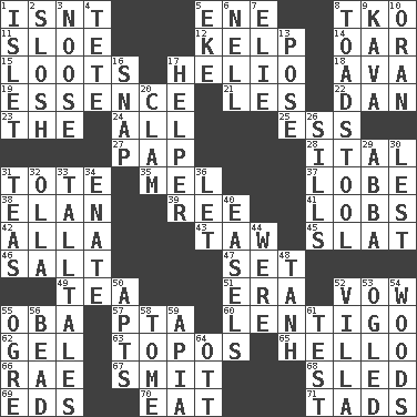ACROSS 1. Is not 5. Compass dir. 8. Ring climax 11. _ gin 12. Seaweed 14. Rowing implement 15. Plunders 17. Sun: prefix 18. Actress Gardner 19. Core 21. French article 22. One of the 12 tribes of Israel 23. Definite Article 24. 100% 25. Double-curved letter 27. Infant food 28. Slanted text style (abbr.) 31. Carry 35. Cartoonist voice _ Blanc 37. Ear part 38. Style 39. Portuguese money of account (variant) 41. Tennis shots 42. Silent film actress Nazimova 43. The 23rd letter of the Hebrew alphabet 45. Narrow board 46. Table seasoning 47. Put into a specified state 49. Afternoon social gathering 51. Period 52. Solemn pledge 55. Chief or king in Benin or Nigeria 57. Parent Teacher Association (abbr.) 60. Small, flat, pigmented spot on the skin 62. Set 63. Traditional theme or motif 65. Phone greeting 66. Actress Charlotte 67. Stricken, poetically 68. Downhill vehicle 69. Begley and Asner 70. Erode 71. Bits DOWN 1. Small island 2. Splash clumsily 3. Trap for birds or small mammals 4. Wig 5. Supplement with great effort 6. 1994 drama film starring Jodie Foster 7. Writer Wiesel 8. Inedible or poisonous agaric 9. Polynesian shrub of the pepper family 10. Northwest Algerian city 13. Introduce or present, as a question 16. Fastener 17. Aide 20. Burrowing marine mollusk 26. Beverly of Met fame 29. Swedish rock group 30. For fear that 31. Beverages made from leaves 32. Spanish pot 33. Baron Munchausen's specialties 34. Related on the mother's side 36. Allow 40. Artist's stands 44. We are 48. Hyperbolic tangent 50. Tenement units (abbr.) 52. Country estate 53. Stared 54. Forest 55. Legendary monster 56. Necklace unit 58. Heavy book 59. Capital of Western Samoa 61. Trial 64. Baseball player Mel