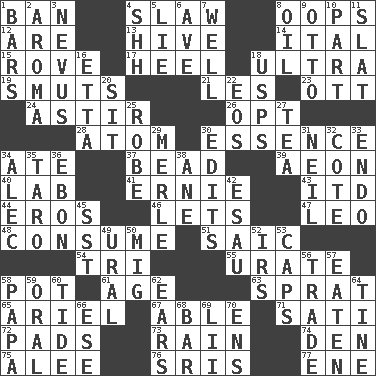 ACROSS 1. Prohibit 4. Cole _ (cabbage dish) 8. I made a mistake 12. "We ___ not amused" (Victoria) 13. Hub of activity 14. Slanted text style (abbr.) 15. Be footloose 17. Person who is morally reprehensible 18. Extreme 19. Obscenities 21. French article 23. Baseball player Mel 24. Moving about 26. Choose 28. Tiny particle 30. Center 34. Had dinner 37. Necklace unit 39. Period of immesurable duration 40. Experiment locale 41. Bert's buddy 43. It would 44. Greek god of love 46. Allows 47. Lion 48. Eat 51. Ketch in the Levant 54. Three (prefix) 55. A salt of uric acid 58. Cooking vessel 61. Personal question 63. Small fatty European fish 65. Satellite of Uranus 67. Competent 71. Suttee (variant) 72. Writing tablets 73. Water falling in drops from the sky 74. Lair 75. Toward shelter 76. Indian titles of respect 77. Compass dir. DOWN 1. Taverns 2. Scent 3. Congenital growth or mark on the skin 4. Quiet! 5. Whopper 6. "___ Maria" 7. Water source 8. Petroleum 9. "Beetle Bailey" pooch 10. Role in a play 11. Narrow board 16. Singer James 18. United States Postal Service (abbr.) 20. Be seated 22. Greek goddess of the dawn 25. Loose flowing garment 27. Afternoon social gathering 29. Haggard of country music 30. Proofreads 31. Famous astronaut Armstrong 32. ____ d'Azur (French Riviera) 33. Inside; within (prefix) 34. Actor Baldwin 35. Edible starchy tuberous root 36. Inky black, to poets 38. One (Scot) 42. Son of Isaac 45. Fast jet (abbr.) 49. Mountain range 50. Russian fighter aircraft 52. Big collection agency 53. Balmoral and tarboosh 56. Swap 57. Eroded 58. Dad 59. Spoken 60. Periodic rise and fall of the sea level 62. Hearing organs 64. Prong on a fork 66. Compass dir. 68. Oblong piece of solid material 69. Cards in a Roman deck? 70. Followers of ems