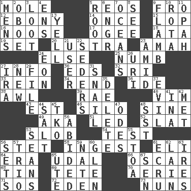 ACROSS 1. Undercover agent 5. Vintage cars 9. Away 12. Dark wood 14. At one time in the past 15. Trim (branches) 16. Trap for birds or small mammals 17. Double curve, resembling the letter S 18. "One Day ___ Time" 19. Arrange properly for use 20. A period of five years 23. Nursemaid 24. Otherwise 25. Unfeeling 27. Information 30. Begley and Asner 32. _ Lanka 33. It's straight from the horse's mouth 34. Tear apart 36. Binary compound 38. Leather borer 39. Actress Charlotte 40. Zeal 43. Eastern Standard Time (abbr.) 46. Grain storage tower 48. Trig term 49. Alias (abbr.) 51. Directed 52. Narrow board 53. Oscar Madison type 54. Trial 56. Proofreading order 58. Consume 61. Connecticut Ivy Leaguer 64. Period 65. Freehold land 66. Witty Wilde 68. Metal container 69. Wig 70. Nest on high 71. Mayday 72. Locale of original sin 73. Religious women DOWN 1. Not women's 2. Mitch Miller's instrument 3. Spoils 4. Followers of ems 5. Carrot, for example 6. Engineer (abbr.) 7. Seas 8. Perceive with the eye 9. Flambe (short form) 10. Round or rotation of duties 11. Brightly colored fish 13. Shout 21. One who uses or employs something 22. Spring feasts 23. Among 24. A really long time 26. RI univ. 27. Retirement account (abbr.) 28. ___ Haven, CT 29. Do some clerical work 31. Slow-paced one 35. Erase 37. Tending to cause great harm 41. _ tizzy (2 wds.) 42. Was introduced to 44. Table seasoning 45. Ring climax 47. Lyric poems 48. Fast jet (abbr.) 50. Tolerated 53. Seines 55. Portico 56. Puts into a specified state 57. Musical group of three 59. Nathan's nickname 60. Small, secluded valley 61. Shade of tan 62. (Had) reclined 63. Angers 65. Shoshoni 67. Elected rep.