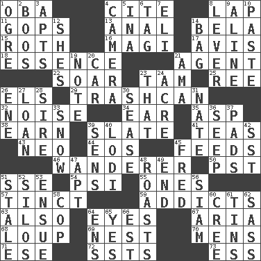 ACROSS 1. Chief or king in Benin or Nigeria 4. Quote 8. Infant locale 11. Republicans 13. Of or related to the anus 14. Actor Lugosi 15. Writer of Portnoy's Complaint (1969) 16. Wise men 17. Deliberation 18. Core 21. Representative 22. Fly high 23. Scottish cap 25. To sift 26. Raised railways 29. File 13 32. Annoying sound 34. Ewer handle 35. Cleo's killer 38. Merit 39. Schedule 41. Beverages made from leaves 43. Modern: prefix 44. Greek goddess of the dawn 45. Eats 46. Nomad 50. Pacific Standard Time (abbr.) 51. Compass dir. 54. Air pressure measure (abbr.) 55. Washington bills 57. Colored lightly or faintly 59. Inveterate users 63. In addition 64. Snake ____ (dice throw) 67. Roberta Peters solo 68. Central Nebraska county 69. Egg locale 70. Not women's 71. Compass dir. 72. Fast planes 73. Curvy letter DOWN 1. Legendary monster 2. Expressions of contempt or scorn 3. Tenement units (abbr.) 4. Device for capturing images 5. _ tizzy (2 wds.) 6. Label 7. Biblical high priest 8. Prying instrument 9. Place in a line 10. Thick mixture 12. "______ My Girl" (Turtles hit) 14. Paper or plastic container 19. Musical sound 20. Automobile 21. Nursemaid (var.) 23. Not this but _ 24. Measure of real estate 26. Compass dir. 27. Grant temporary use of 28. Title for a man of rank and authority 30. Gospel singer Marvin 31. Nathan's nickname 33. Overwhelm 36. Ooze 37. Groovy apts. 39. Elected reps. 40. Farming town in central California 42. Fast jet (abbr.) 45. Flintstone 47. Fitting 48. Cooks with dry heat, as in an oven 49. Conclude 51. Having lost freshness 52. Grain storage towers 53. Take place subsequently 56. Thailand, formerly 58. Police officer (slang) 60. Algonquian 61. Metal containers 62. Backtalk 64. Followers of ems 65. Consenting reply 66. Eastern Standard Time (abbr.)