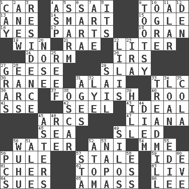 ACROSS 1. Automobile 4. Slender Brazilian palm 9. Frog relative 13. A saturated hydrocarbon 14. Don Adams' spy role 15. Stare at amorously 16. Affirmative reply 17. Actors' quests 18. NW Algerian seaport 19. Victory 21. Actress Charlotte 22. 61 cubic inches 24. Dormintory (informal) 26. Big collection agency 27. Honkers 29. Kill 30. The wife of a rajah (variant) 31. Jai ____ 33. Affectionate concern, for short 36. Curve 37. Out of fashion; old fashioned 40. Friend of Pooh 41. Compass dir. 42. Sew up the eyelids of hawks and falcons 43. Perfect 45. Arches 47. Climbing, woody, usually tropical vines 48. Ocean 49. Downhill vehicle 50. Wetness 52. Black tropical American cuckoo 54. Madame (abbr.) 56. Whimper 57. Having lost freshness 59. Binary compound 61. "Mermaids" star 62. Literary convention 63. 54 in ancient Rome 64. Institutes legal proceedings 65. Collect or gather 66. Area sheltered from the wind DOWN 1. Island 2. Afresh 3. Dwelling 4. Cleo's killer 5. Excessive but superficial compliments 6. "Two Mules for Sister ____" 7. Johnson of "Laugh-In" 8. It is 9. Tootsie (variant) 10. Legendary monster 11. Having or resembling wings 12. Lair 20. Characteristic smell of wine 22. Ms. Damita and namesakes 23. Lyricist Gershwin 25. Coral collection 27. Pate de foie ____ 28. Hearing organs 29. Move on water 31. Ripens 32. Sodium hydroxide 33. Excercise machine 34. Grant temporary use of 35. Root beer relative 38. Witty Wilde 39. Land elevation 44. South Vietnam president (1954) 45. Michaelmas daisies 46. To riddle 49. Grain storage towers 50. Chinese city south-southwest of Nanjing 51. Toward shelter 52. Smallest unit of an element 53. California wine valley 55. Singer Brickell 56. Personal Computers (abbr.) 57. R.R. building 58. Curvy letter 60. First lady