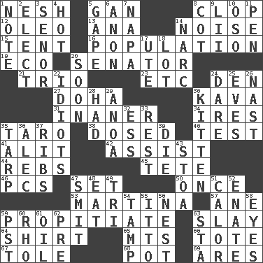 ACROSS 1. Tender 5. Separate the seeds from cotton 8. Hoof sound 12. Butter sub 13. Santa ___, CA 14. Annoying sound 15. Portable shelter 16. Census information 19. Environmental prefix 20. Legislator 21. Musical group of three 23. And so on (abbr.) 24. Lair 27. Capital of the state of Qatar 30. Polynesian shrub of the pepper family 31. More lacking in sense or substance 34. Angers 35. Edible starchy tuberous root 38. Administered medicine 40. Trial 41. Came down and settled, as after flight 42. Help 44. Confederate soldiers (slang) 45. Wig 46. Personal Computers (abbr.) 47. Arrange properly for use 50. Single time 53. Chrissie's court nemesis 57. One (Scot) 59. Conciliate 63. Kill 64. Chest covering 65. Mountains (abbr.) 66. Haul 67. Lacquered or enameled metalware 68. Plant holder 69. Ancient Greek god of war DOWN 1. Brief written record 2. Choose 3. Sir (Sp.) 4. Being at a high temperature 5. Stare wonderingly 6. At once, immediately (arch.) 7. California wine valley 8. Small bed 9. Cards in a Roman deck? 10. Bear (Spanish) 11. Fenced enclosure 14. Drug cop 17. Shoshoni 18. Car dealer's back yard 20. Within a short period 22. Foolish or stupid persons 24. Have the gumption 25. Nights before holidays 26. Political cartoonist Thomas 28. Possessed 29. Small Philippine buffalo 30. Baby cat 32. Double-curved letter 33. Take ten 35. Canvas cover 36. Actor Baldwin 37. Teases 39. Expire 43. Portico 47. Stricken, poetically 48. Ingest 49. Three (prefix) 51. Bodily heat indicating an inflammation 52. Maternal 54. Pack (down) 55. "Tell ____ the Marines!" 56. A home for chicks 58. Sight organs 59. Pacific Standard Time (abbr.) 60. 17th letter of the Greek alphabet 61. Lubricate 62. Before (prefix) 63. R.R. building