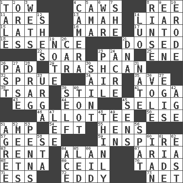 ACROSS 1. Pull behind 4. Crow sounds 8. To riddle 11. Ancient Greek god of war 13. Nanny 14. One who doesn't tell the truth 15. Thin strip of wood or metal 16. Female horse 17. To (old English) 18. Core 21. Administered medicine 22. Fly high 23. Baking dish 25. Compass dir. 26. Groovy apt. 29. File 13 32. Disorder 34. Atmosphere 35. "___ Maria" 38. Russian ruler of old 39. Vertical member of a panel or frame 41. Ancient Roman robe 43. Oval reproductive body of a fowl 44. A really long time 45. Former Milwaukee Brewers owner Bud 46. One to whom something is allotted 50. Compass dir. 51. Electrical Unit 54. Bank Draft (abbr.) 55. Coop moms 57. Honkers 59. Stimulate to action 63. Monthly bill 64. ____ Jay Lerner 67. Roberta Peters solo 68. Inactive volcano in Sicily 69. To provide with a ceiling 70. Small boys 71. Double-curved letter 72. Whirlpool 73. Fish or hair follower DOWN 1. Lie 2. Mouths or openings 3. Moistens 4. Device for capturing images 5. Housemaid (var.) 6. Armed conflict 7. A female animal or person 8. Remove soap 9. Consumed 10. Eat (away) 12. "______ My Girl" (Turtles hit) 14. Nilotic language 19. Make mention of 20. 4-wheeled motor vehicle 21. Heredity factor (abbr.) 23. Silvers or Donahue 24. 1/640 square mile 26. Pacific Standard Time (abbr.) 27. Domed church section 28. To draw with force 30. Inhabitant of Heaven 31. Nathan's nickname 33. Capital and largest city of Mongolia 36. Short-tailed, large-bodied rat 37. Armor plate that protects the chest 39. Automatic 40. A blast of a horn 42. Ripen 45. Elected reps. 47. Area sheltered from the wind 48. Without force or sincere effort 49. Car or cant ending 51. Match 52. Confronts 53. Actor Sean's family 56. Petty quarrel 58. R.R. building 60. SW Asia republic 61. Travel on an animal 62. Compass direction 64. Adept person 65. Directed 66. Assist