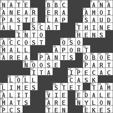 ACROSS 1. Nathan's nickname 5. English channel? 8. Santa ___, CA 11. Approach 13. Epoch 14. Mine, in Marseilles 15. Thick mixture 16. Pet locale 17. Saudi Arabian king (1953-1964) 18. The first octave above the treble staff 19. Go away! 21. One or ones belonging to thee 22. To the inside or interior of 24. Coop moms 25. Buttonhole 27. Bear (Spanish) 29. Promenade 30. To the left, to Queeg 32. Type of rug 33. Leg coverings 35. Mitch Miller's instrument 39. Trap for birds or small mammals 41. Piece 42. Call ___ day 43. Medicinal drug used to evoke vomiting 45. Hang loosely or laxly 48. Keg 49. Citrus fruits 50. Proofreading order 52. Scottish cap 55. Set down 56. Compete 57. Peak District village in England 59. Floor coverings 60. "We ___ not amused" (Victoria) 61. Thermoplastic polyamide 62. Personal Computers (abbr.) 63. Nine, plus one 64. Makes supply last DOWN 1. California wine valley 2. Of or related to the anus 3. One of the two male reproductive glands 4. Erode 5. Actor Lugosi 6. Naughty child 7. Head covering 8. At full speed 9. Parts of speech 10. Helper 12. Musical pauses 14. American tennis player Robert 20. Small bed 21. Son of Odin 23. Pitcher Ryan 25. Nanny (var.) 26. Automobile 27. Elect 28. Distress signal 30. One (Scot) 31. Drinks excessively 33. Plant holder 34. White ___ sheet 36. Sass 37. Mouth or opening 38. And so on (abbr.) 40. Lubricates 43. Frozen water 44. Eucharist need 45. Pale purple color 46. Leaves out 47. Allows 49. Desk light 50. Father 51. Adolescent 53. Medicinal plant 54. Not women's 56. Large container 58. Color
