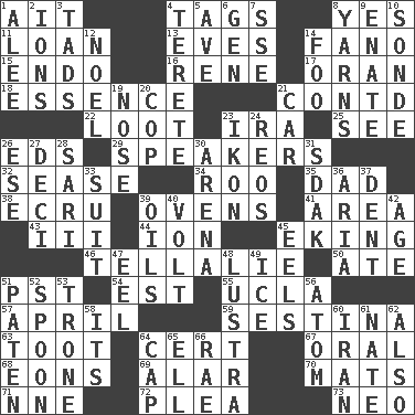 ACROSS 1. Small island 4. Labels 8. It is so 11. Grant temporary use of 13. Nights before holidays 14. Papal veil 15. Inside; within (prefix) 16. French philosopher Descartes 17. Northwest Algerian city 18. Substance 21. Continued (abbr.) 22. Spoils 23. Lyricist Gershwin 25. Observe 26. Begley and Asner 29. Orators 32. Gospel singer Marvin 34. Friend of Pooh 35. Male parent 38. Shade of tan 39. Baking chambers 41. Length times width 43. One more than two 44. Electrically charged atom 45. Supplementing with great effort 46. Copy Pinocchio 50. Had dinner 51. Pacific Standard Time (abbr.) 54. Eastern Standard Time (abbr.) 55. Southern CA. univ. 57. Showery time 59. French poetic form 63. A blast of a horn 64. An absolute certainty 67. Relating to the mouth 68. Immeasurably long periods of time 69. Having or resembling wings 70. Floor coverings 71. Compass dir. 72. Entreaty 73. Modern: prefix DOWN 1. Toward shelter 2. Charged particles 3. Bits 4. Cylindrical with tapered ends 5. "___ Maria" 6. Commissioned military rank (abbr.) 7. Compass dir. 8. Entertaining tales 9. Maternal 10. Message 12. Christmas carol 14. Egg _ yung 19. Characteristic smell of wine 20. Police officer (slang) 21. Auto 23. Visual representation of an object 24. Vintage cars 26. Compass dir. 27. Tenth: prefix 28. Indian skirt 30. Sports stadium 31. Neighbor of Neb. 33. Set of matching outer garments 36. Operatic vocal solo 37. Gouge 39. Lubricates 40. Electrical Unit 42. Mature 45. Snakelike fish 47. Snakelike fish 48. A period of five years 49. Frozen water 51. Eucharist need 52. Soup utensil 53. Marketplace scale 56. Tiny particle 58. ___ a Wonderful Life 60. SW Asia republic 61. Nathan's nickname 62. In addition 64. Head covering 65. Pipe bend 66. Actress Charlotte